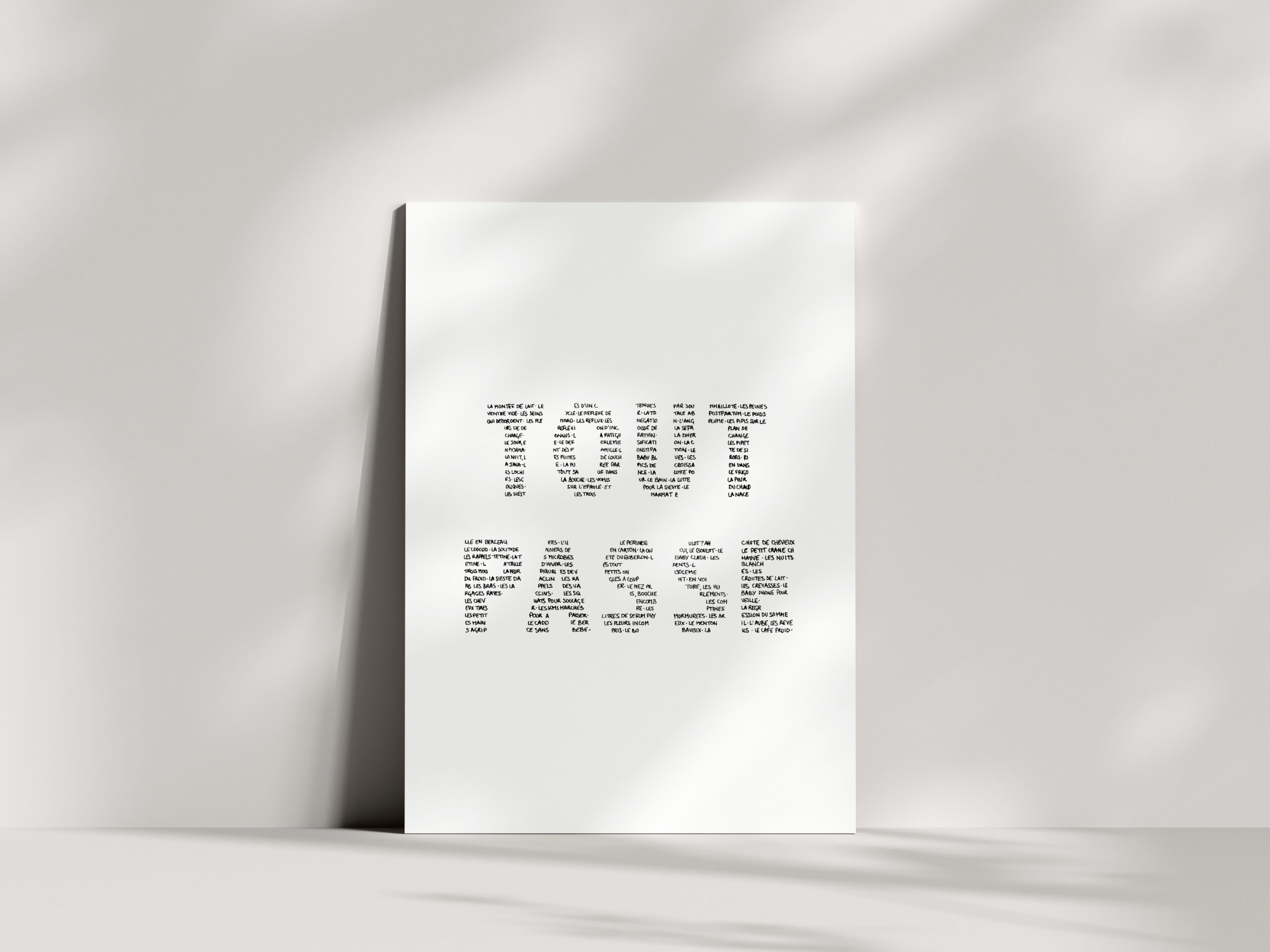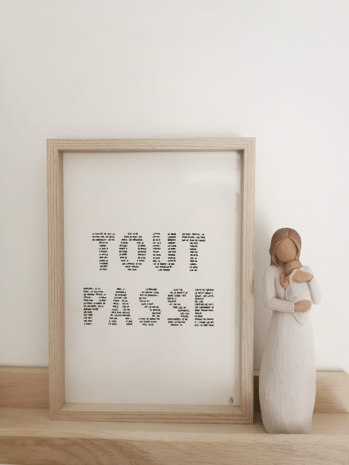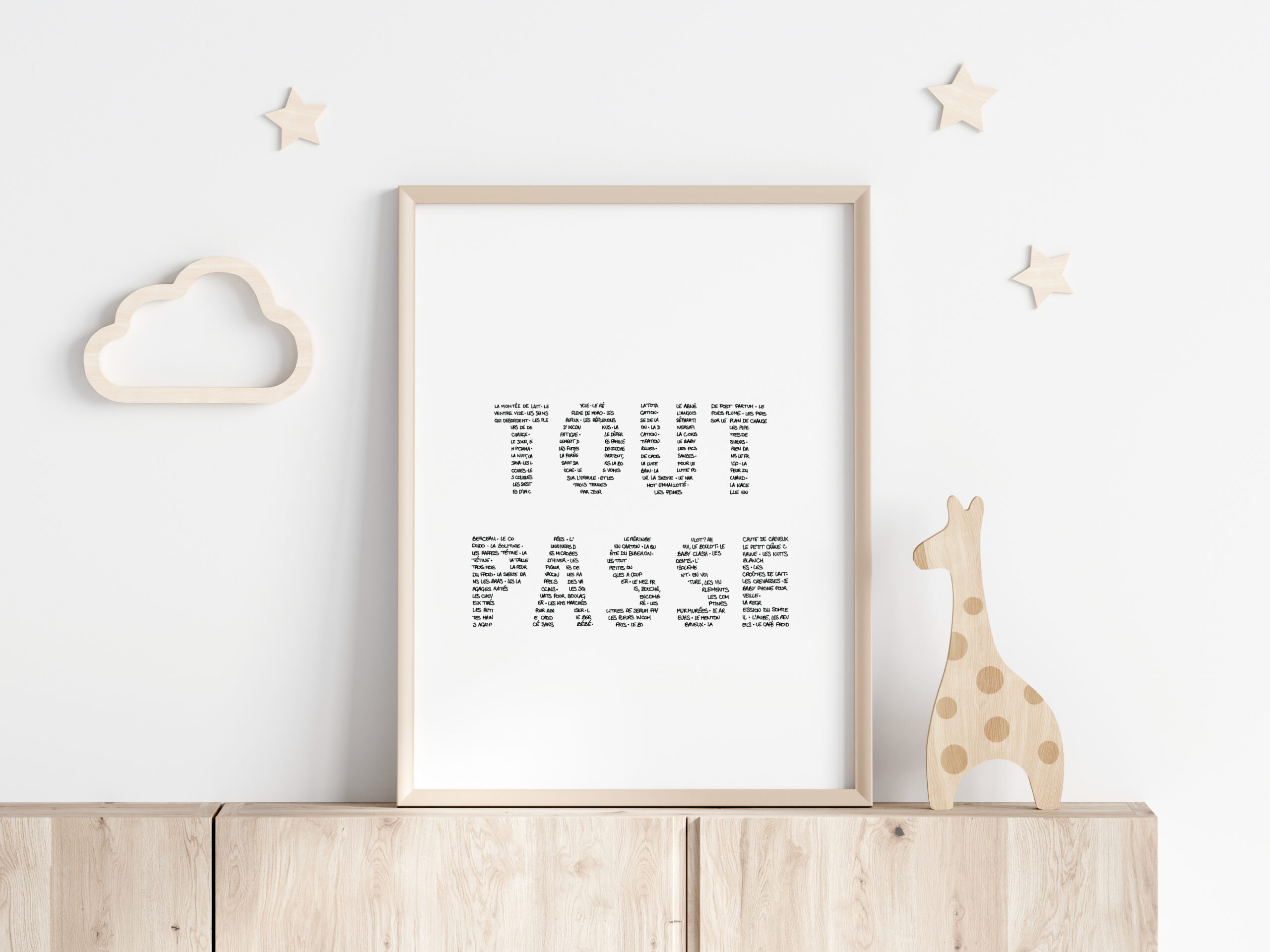 STUDIO PARDELA L’affiche « Tout Passe » ce sont une multitude de mots en lien avec les premières galères de parents qui forment les lettres de l’affiche. (Montée de lait, les reflux, le babyblues…) Une très bonne idée cadeau de naissance.