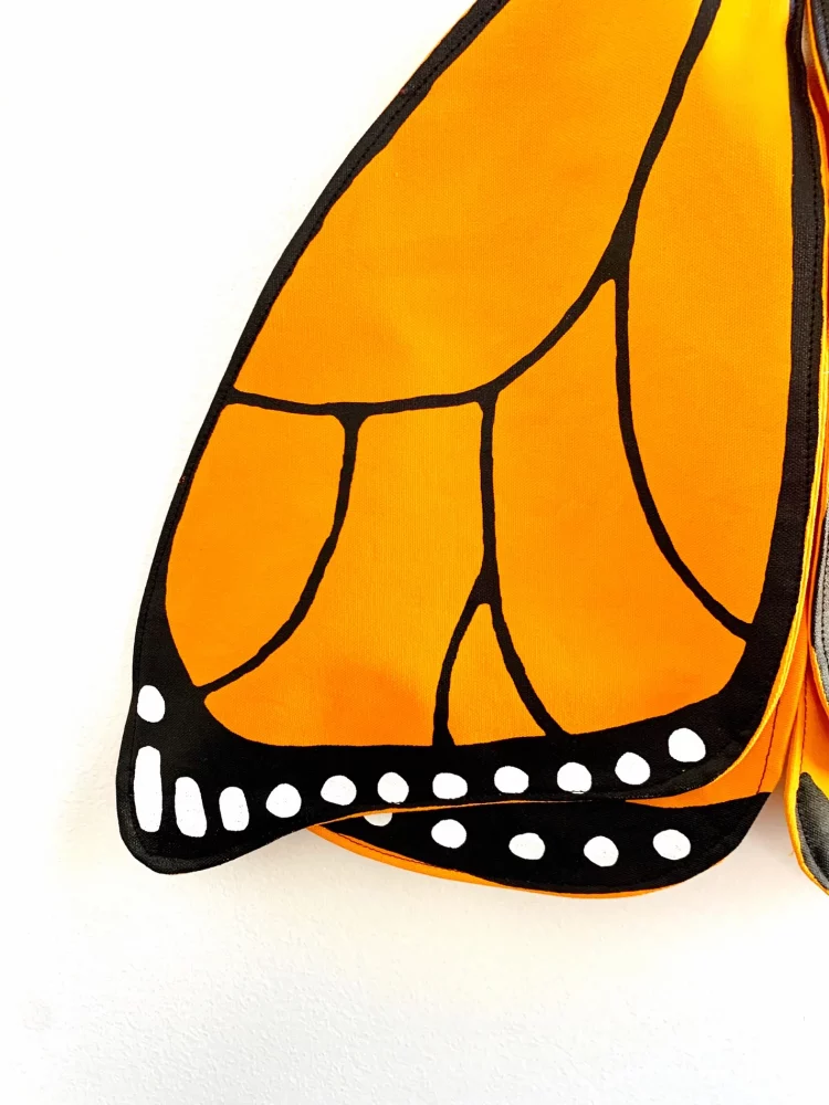 Ces ailes de papillon pour enfants ne manqueront pas de faire tourner les têtes et de susciter de petites imaginations. La toile 100% coton orange la plus douce a été méticuleusement peinte à la main pour mettre en valeur une belle tenue de papillon monarque qui est prête pour jouer à s’habiller et à faire semblant.