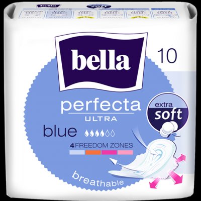 Serviettes hygiéniques Bella Perfecta ultra blue, ultra-minces, imperceptibles même sous une tenue très ajustée. Serviette non-tissé Extra Soft, qui protège parfaitement la peau contre les irritations, assurant un confort d’utilisation.