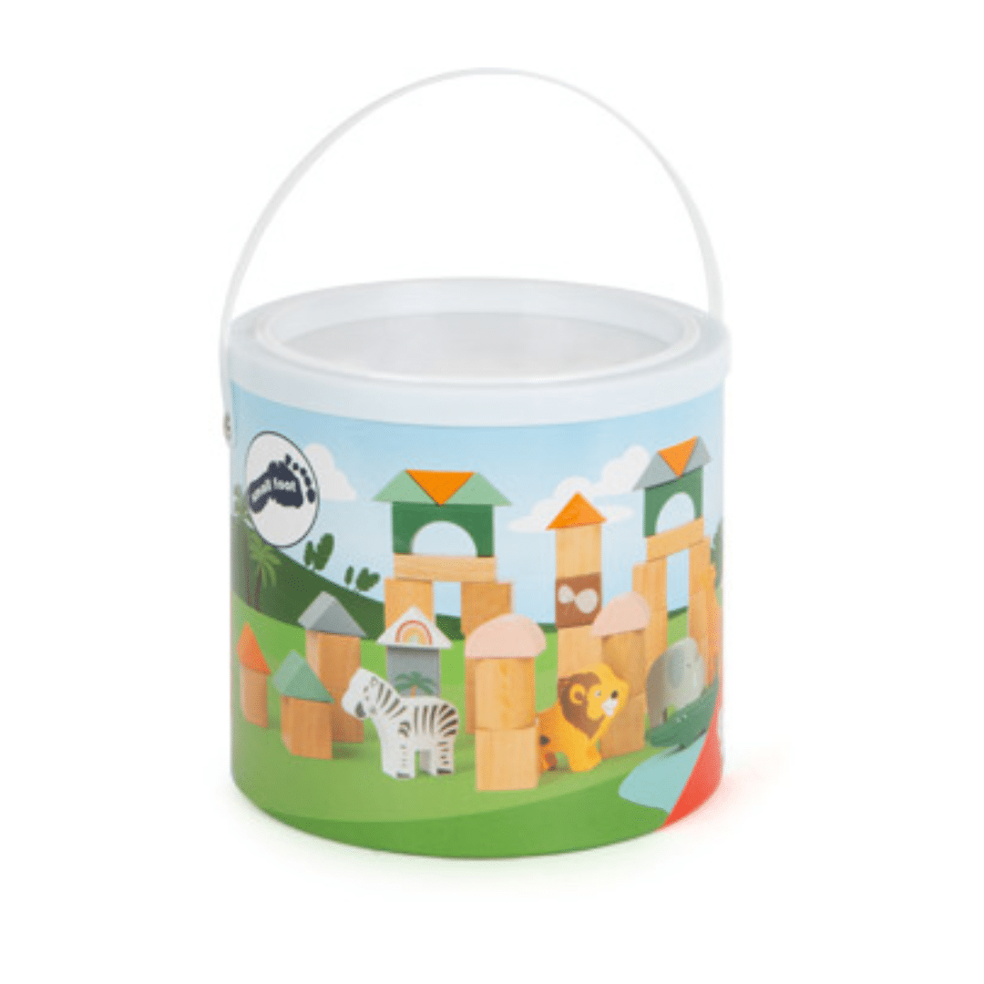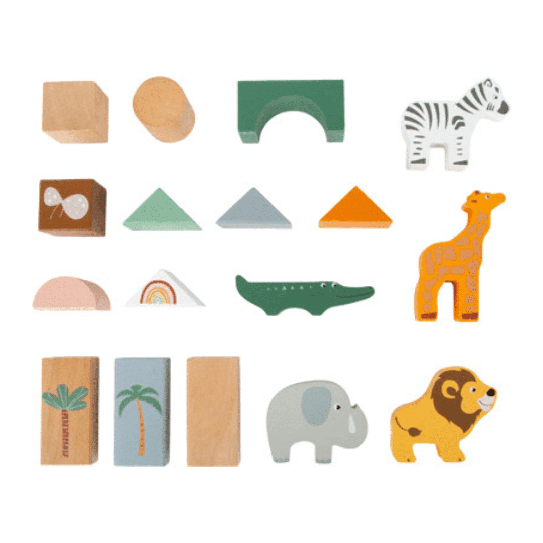 Ce set de blocs de construction safari en bois de 50 pièces convainc les petits constructeurs avec un grand choix de blocs de construction en bois, de formes et de conceptions différentes dans des couleurs délicates.
