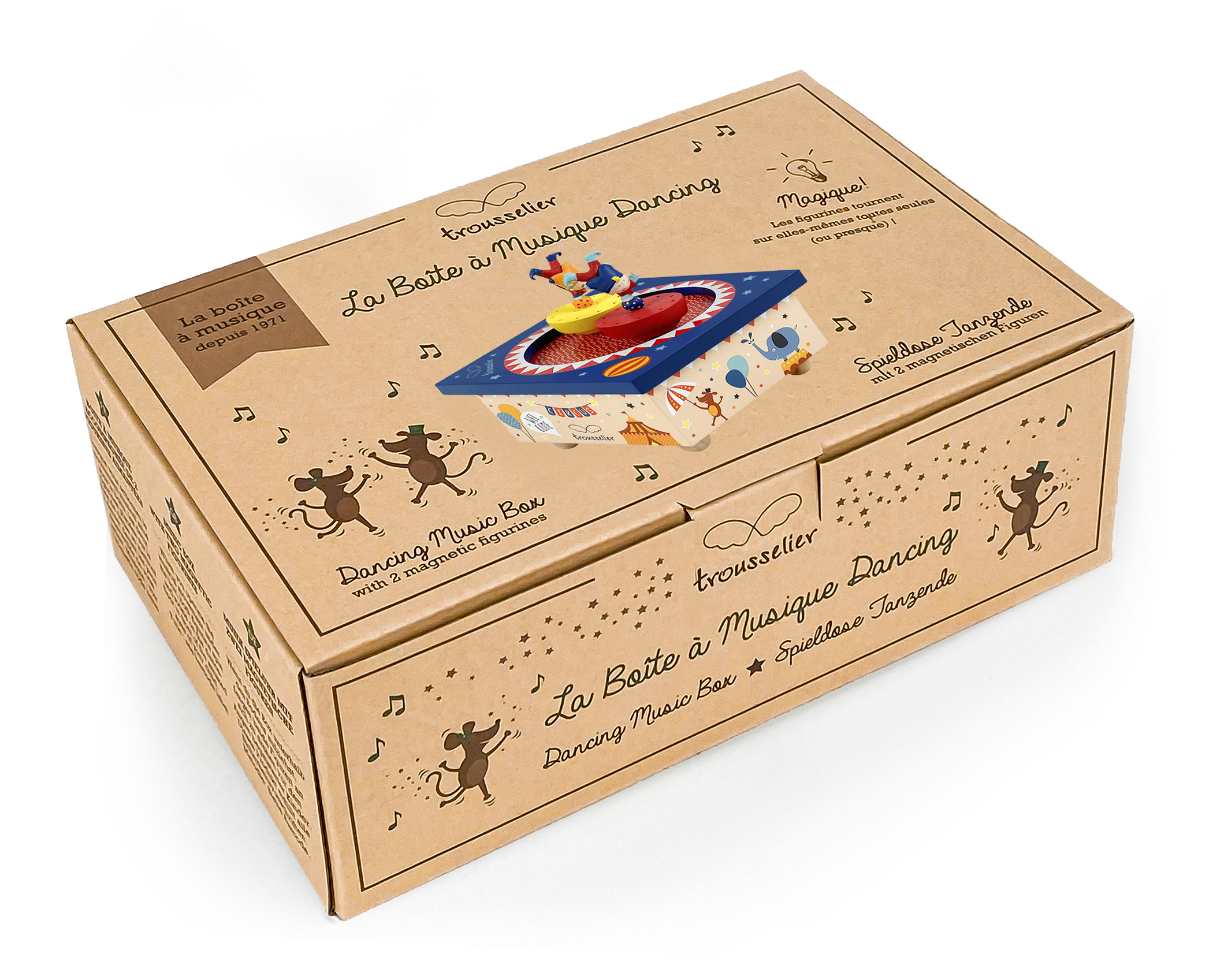 TROUSSELIER La Boîte à musique avec ses figurines qui tournent en rond grâce à un système d’aimants est un véritable classique depuis 1971, et représente une superbe idée de cadeau de naissance. Décoration pour la chambre de bébé mais aussi fascinante et apaisante, idéale à inclure dans le rituel du coucher de bébé.