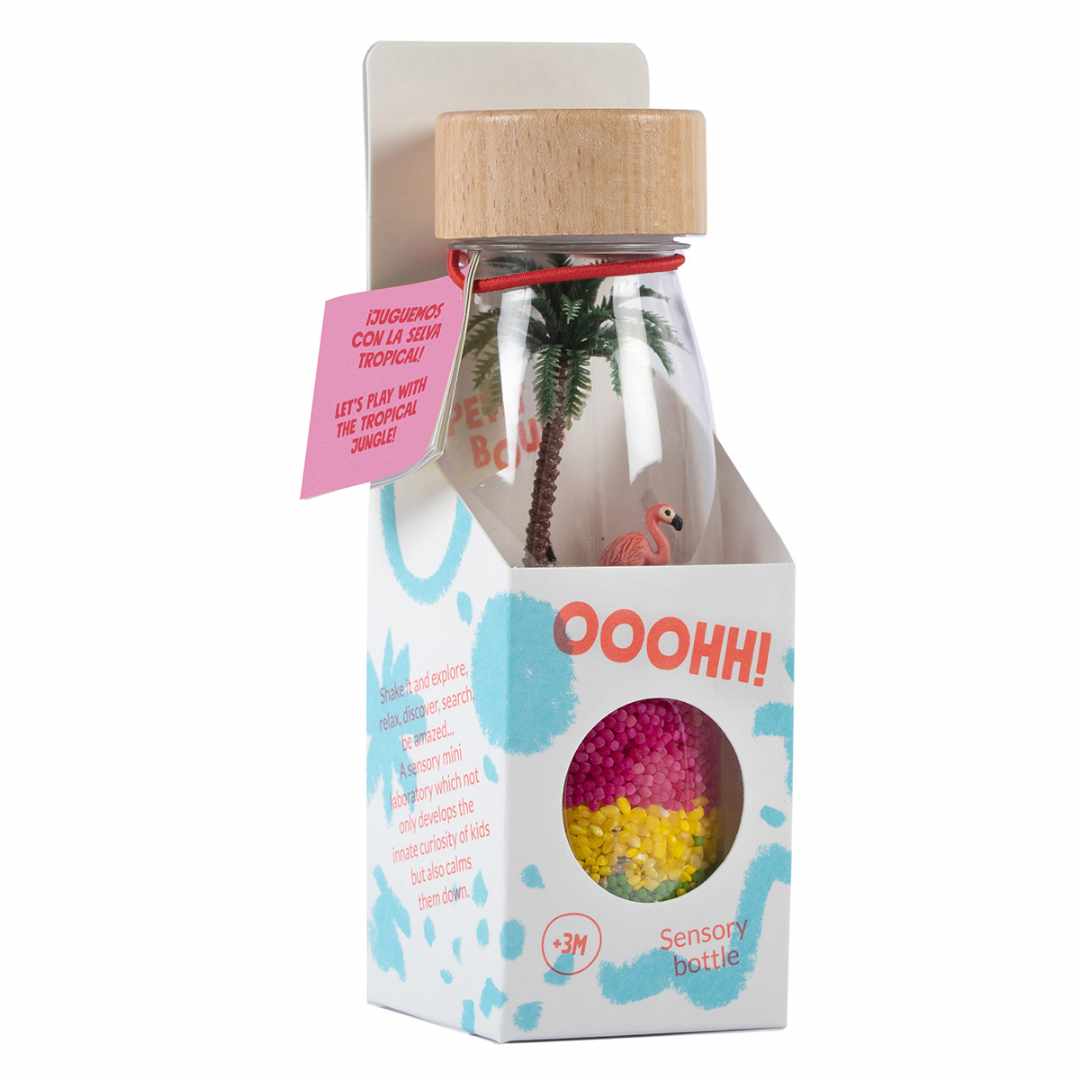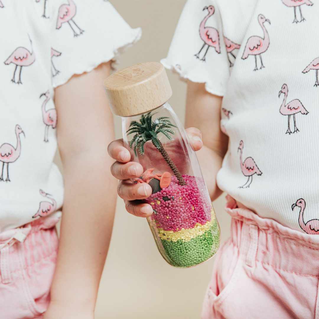 Parce que la bouteille sensorielle ESPION FLAMAND ROSE est petite et facile à prendre en main Parce qu’elle stimule la vue avec différentes matières et animaux Parce qu’elle est un super support de communication et d’échanges avec ses animaux cachés Parce qu’elle émet des sons plus ou moins forts Parce que son bouchon est en bois naturel, sans risque pour l’enfant Parce que son design et ses couleurs sont agréables