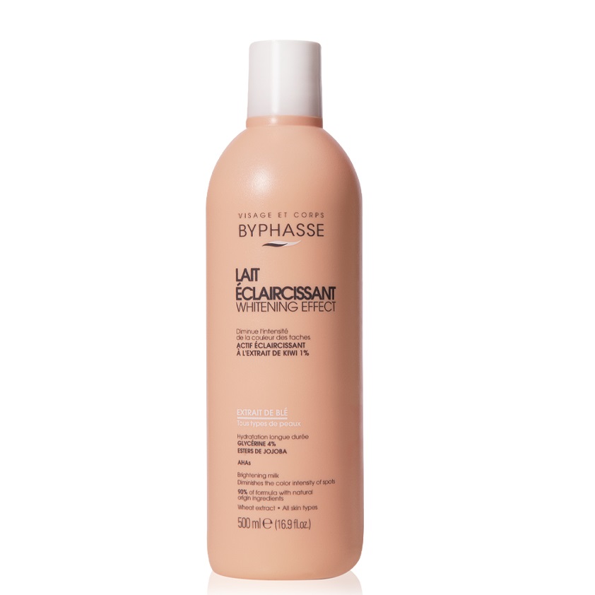 Le lait unificateur de teint à l’extrait de blé diminue l’intensité de la couleur des taches sur le visage, le cou, les mains et le corps. Sa formule combine un actif éclaircissant d’origine naturelle avec de l’allantoïne et des acides alpha hidroxy qui unifient le teint de la peau. Contient de la glycérine et des esters de jojoba pour une hydratation prolongée et une peau lisse et douce. Absorption rapide. Marque: Byphasse