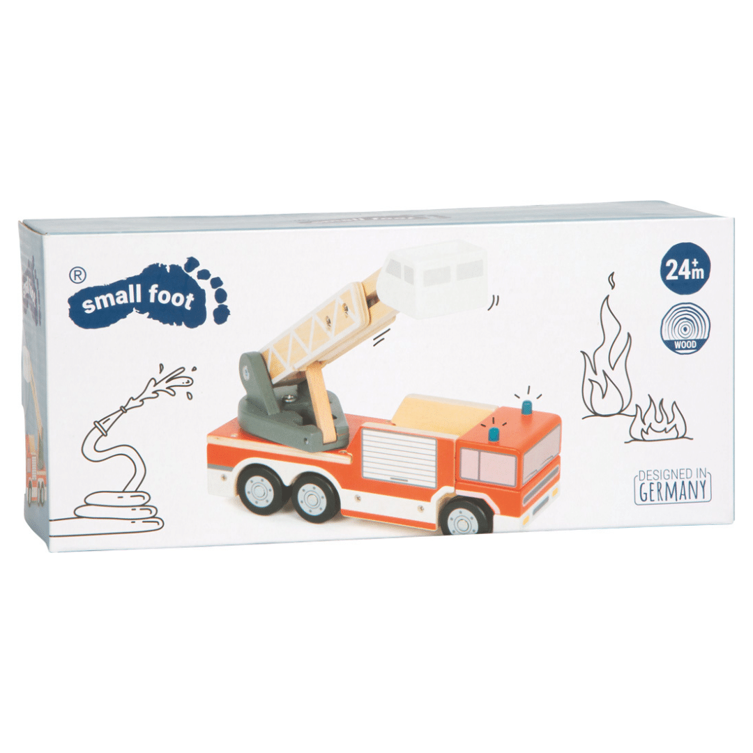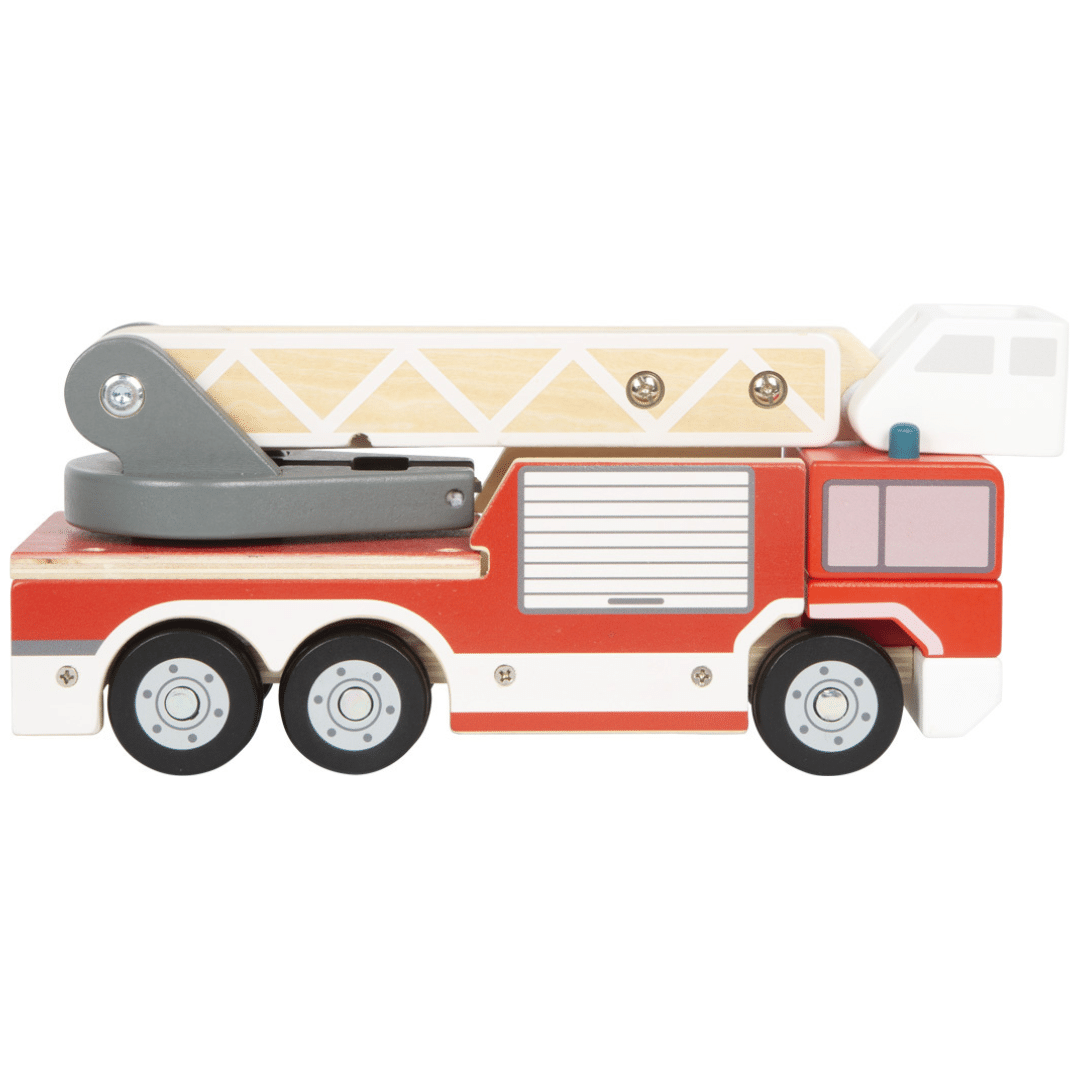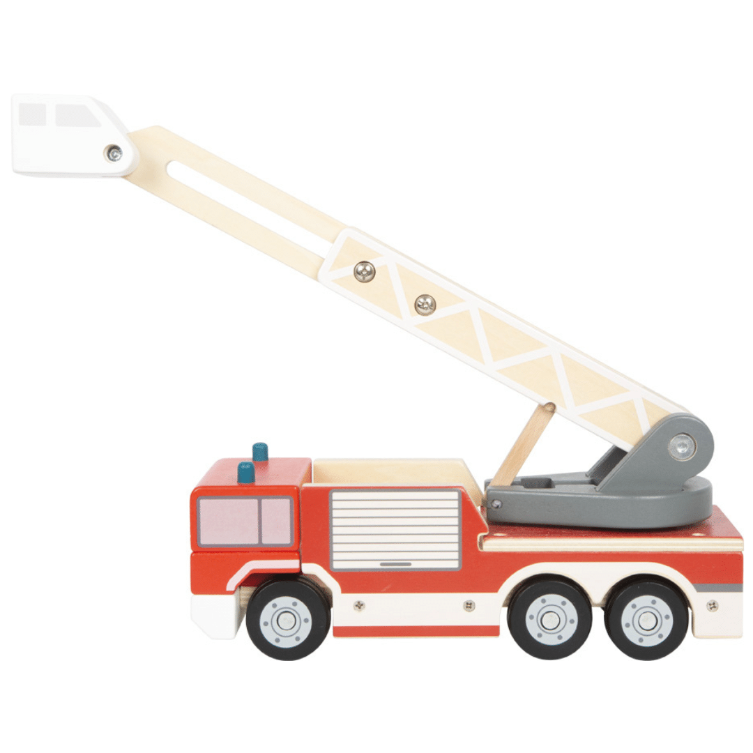 Échelle rotative à 360°, extensible avec nacelle mobile Barre de sécurité pour des missions encore plus réalistes Commandes manuelles simples, adaptées aux petites mains Roues en caoutchouc silencieuses, pour un jeu tout en douceur Construction en bois stable et durable, pour une longue durée de vie Stimule la créativité et la motricité fine des jeunes pompiers