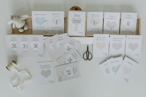 Vous allez trouver 20 cartes qui vous accompagnent depuis la première échographie et la première fois que vous allez sentir bébé bouger. Il y a aussi les différentes semaines de grossesse (10, 20, 25, 30, 33, 35, 37, 38, 39 semaines). Il y a également le jour du terme ainsi que le jour de la naissance de bébé. Vous trouverez également des cartes pour immortaliser quand bébé est dans vos bras et des cartes pour y déposer vos mots.