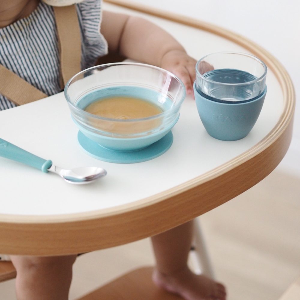Set repas vert Béaba composé d’une assiette avec ventouse, d’un bol et d’un gobelet en verre pour apprendre à bébé à manger seul