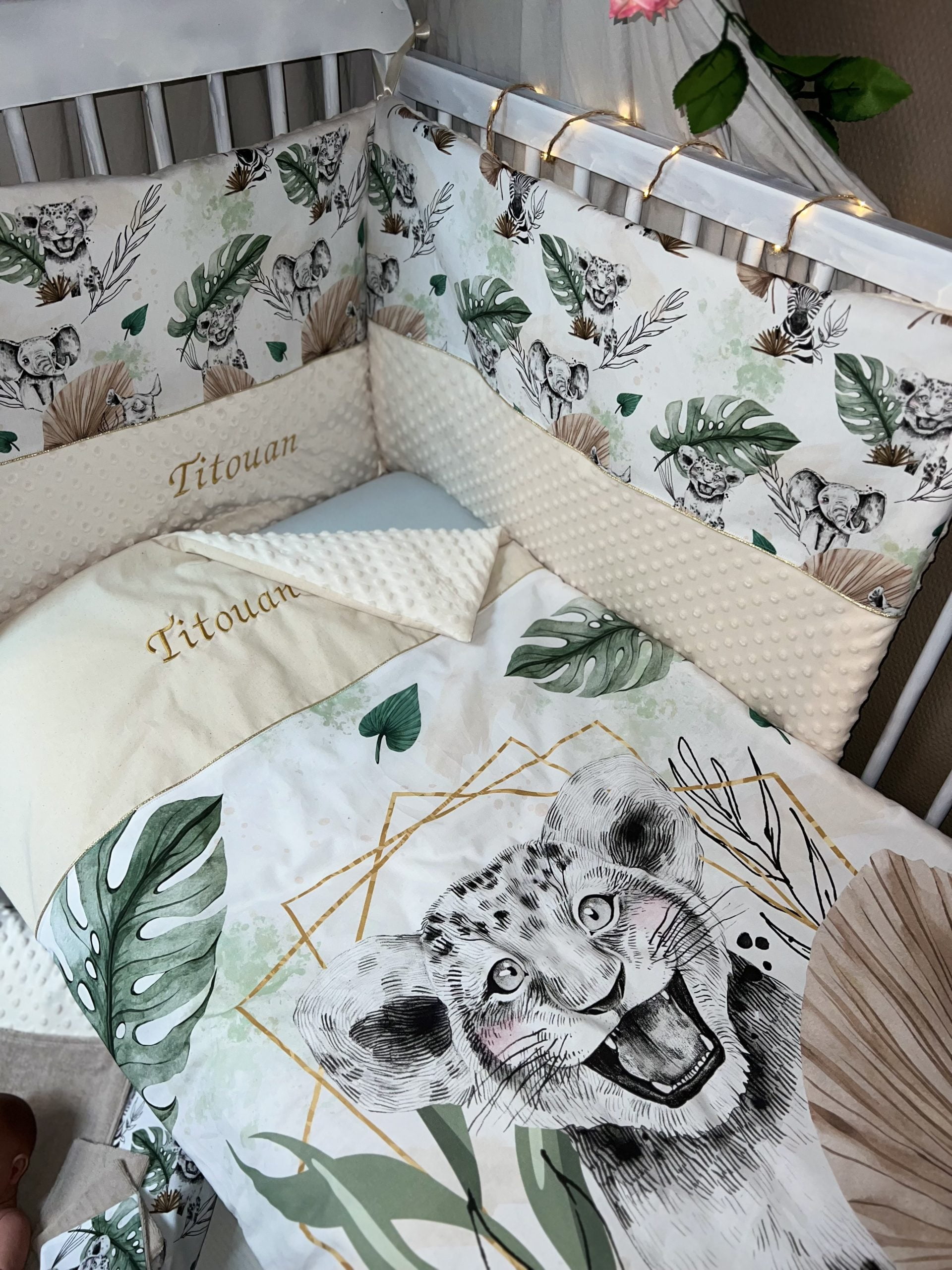 Ce modèle exclusif “Savane”, dessiné par mes soins, plonge bébé dans un univers chaleureux aux notes végétales et animales.