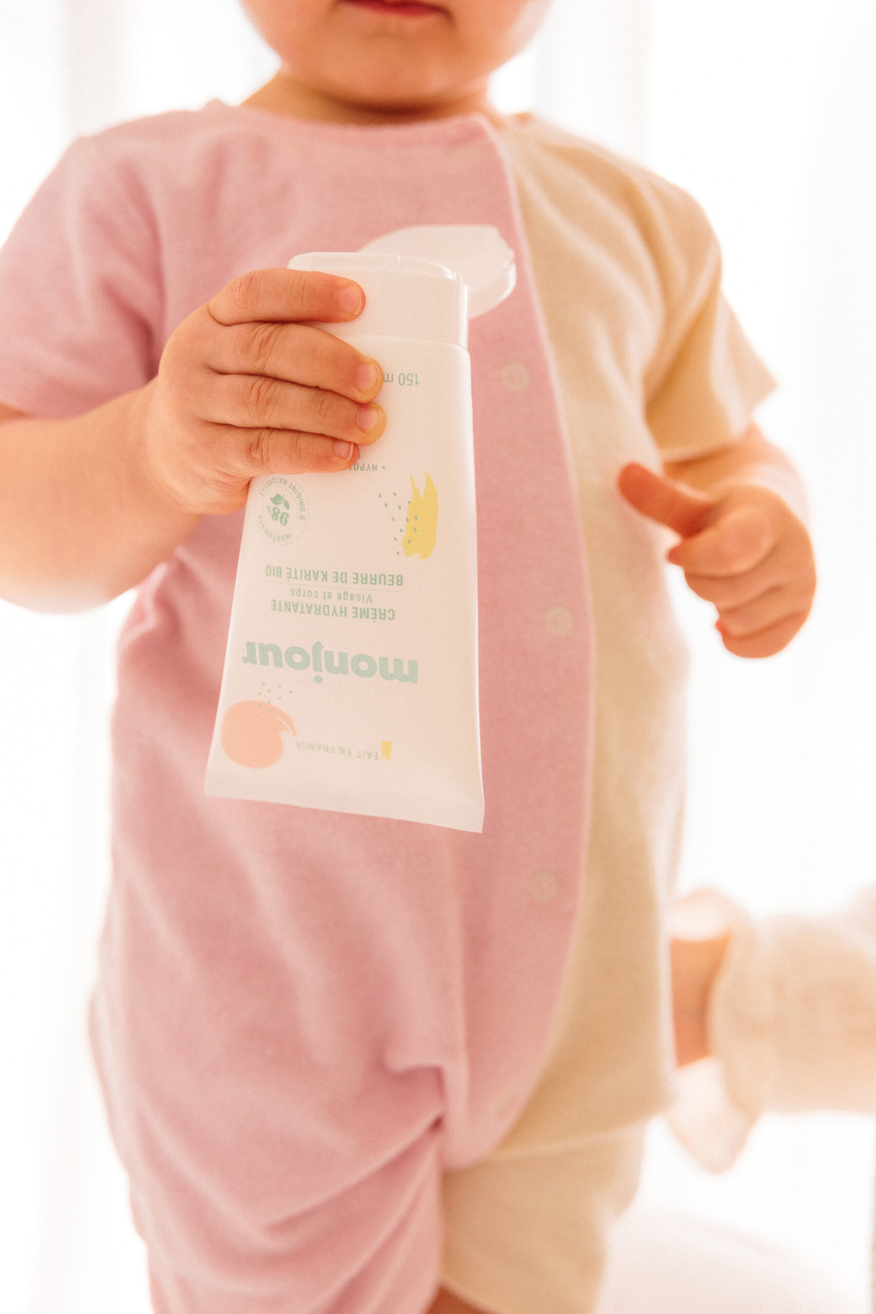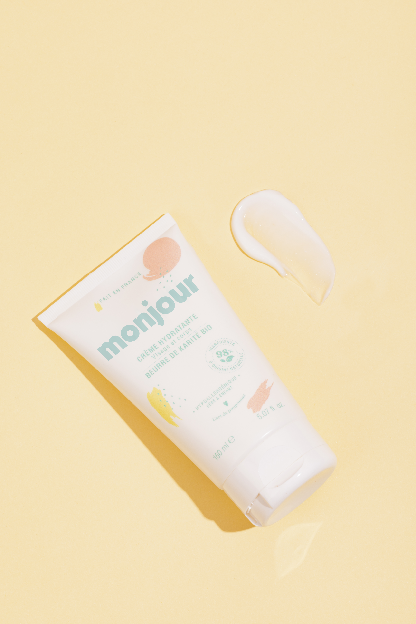 MONJOUR Une crème toute douce pour hydrater toute la famille.  Elle est adaptée pour le visage et le corps dès la naissance. Sa douce odeur de fleur d’oranger et musc blanc seront un vrai bonheur pour vous et votre bébé. 98% d’ingrédients d’origine naturelle, testée sous contrôle dermatologique. Composée de beurre de karité BIO et glycérine végétale BIO.