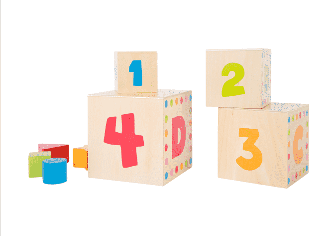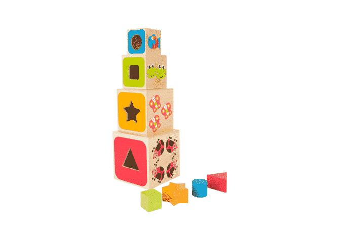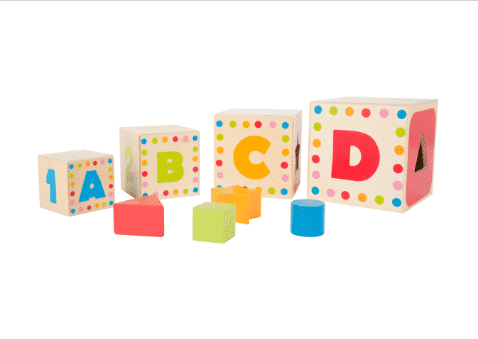 Parce que ses cubes à empiler “Alphabet” sont en bois, le jeune enfant peut porter les pièces en bouche Parce que ses arrêtes sont arrondies, les cubes ne sont pas dangereux Parce que les motifs sont colorés et agréables Parce que les 4 cubes sont munis d’emporte pièces, ils accompagnent l’enfant à trouver la bonne forme et à mettre dedans. Parce qu’ils permettent d’acquerir des notions : grand/petit, dedans/dehors, dessus/dessous Parce que les enfants adorent construire pour faire tout tomber !!!