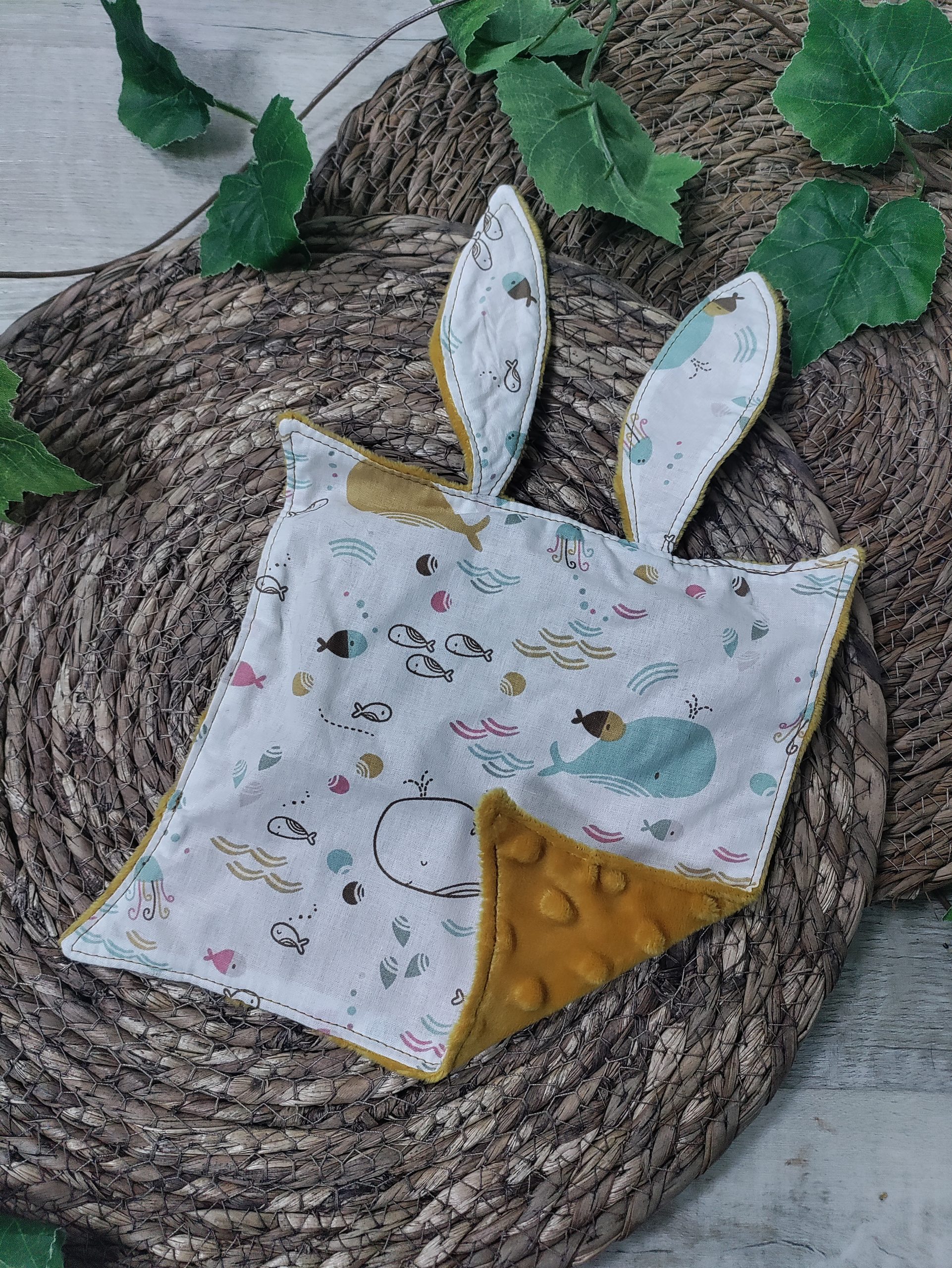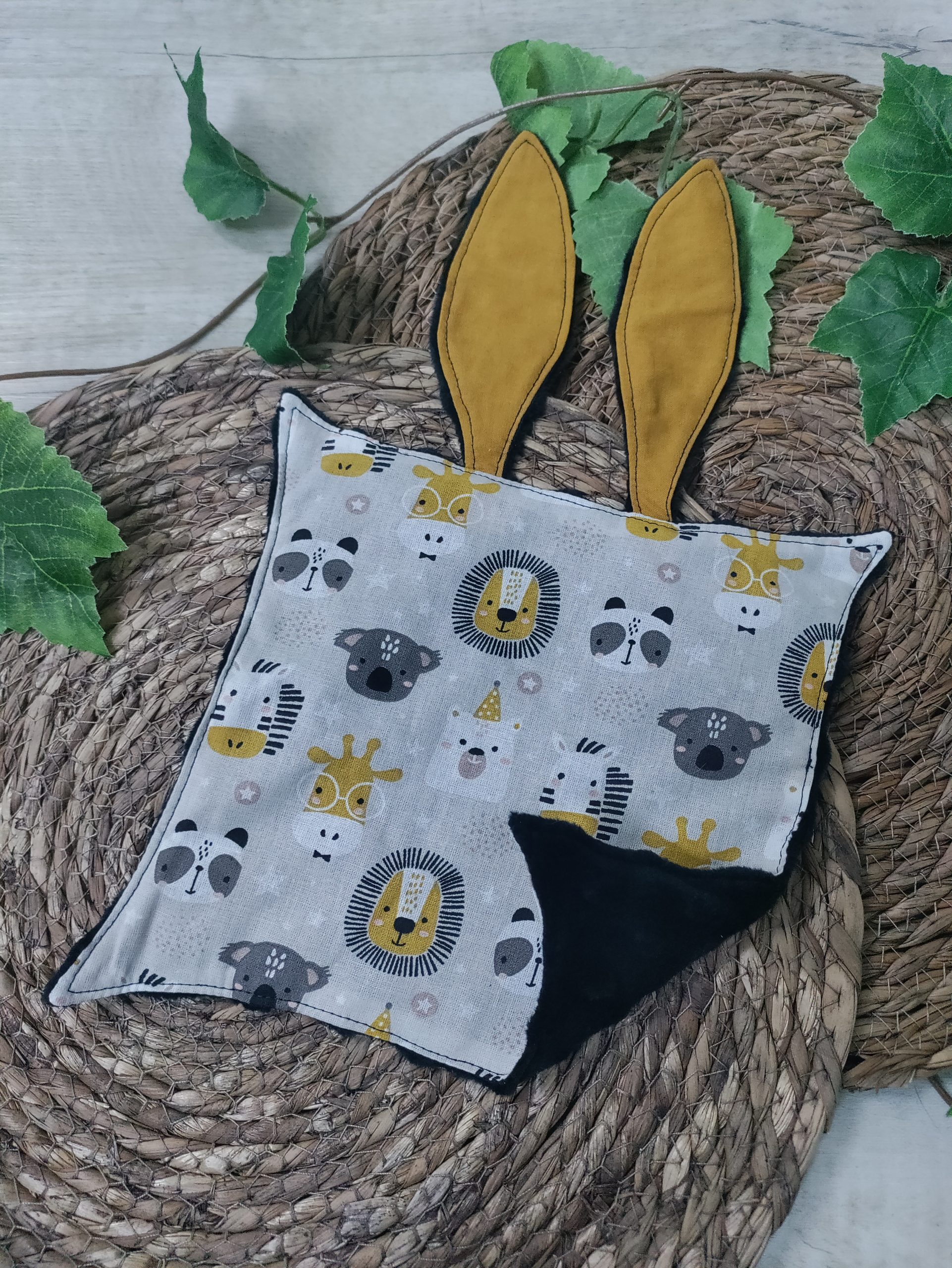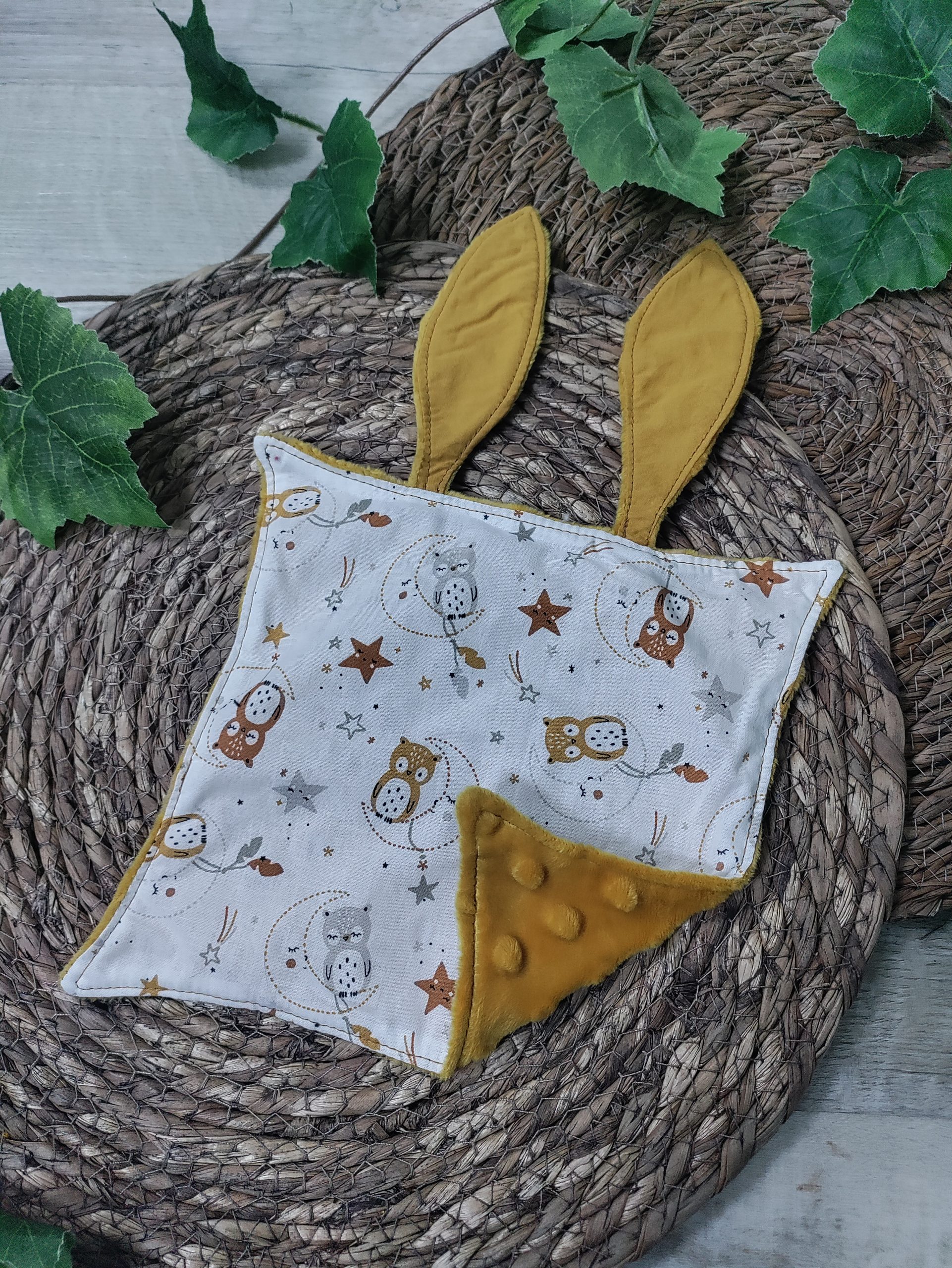 Le doudou lapin est le premier compagnon de bébé. Confectionné en minky ultra doux, il est parfait pour les câlins et les petites mains curieuses. Ses grandes oreilles à mordiller ou manipuler stimulent les sens de bébé tout en l’apaisant.