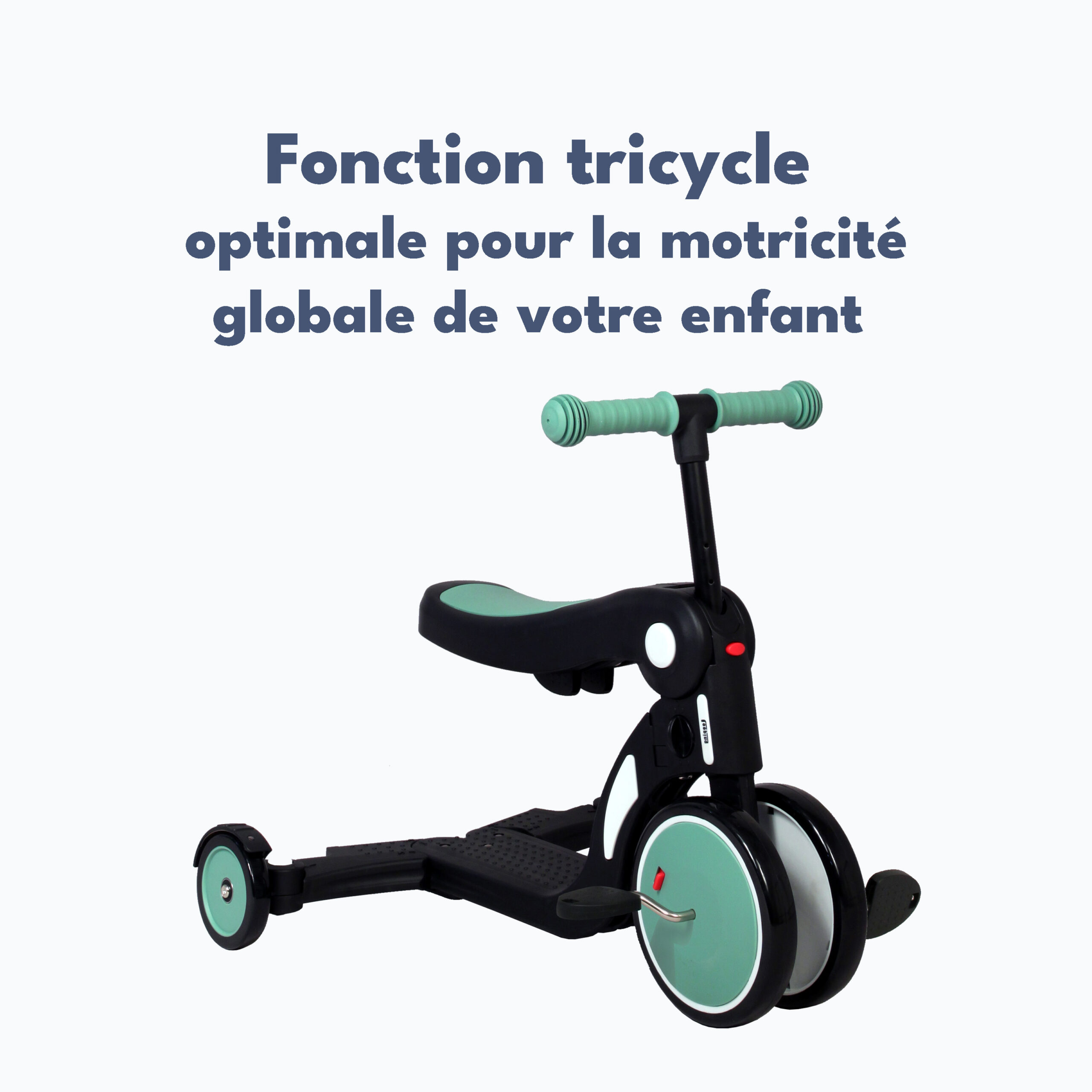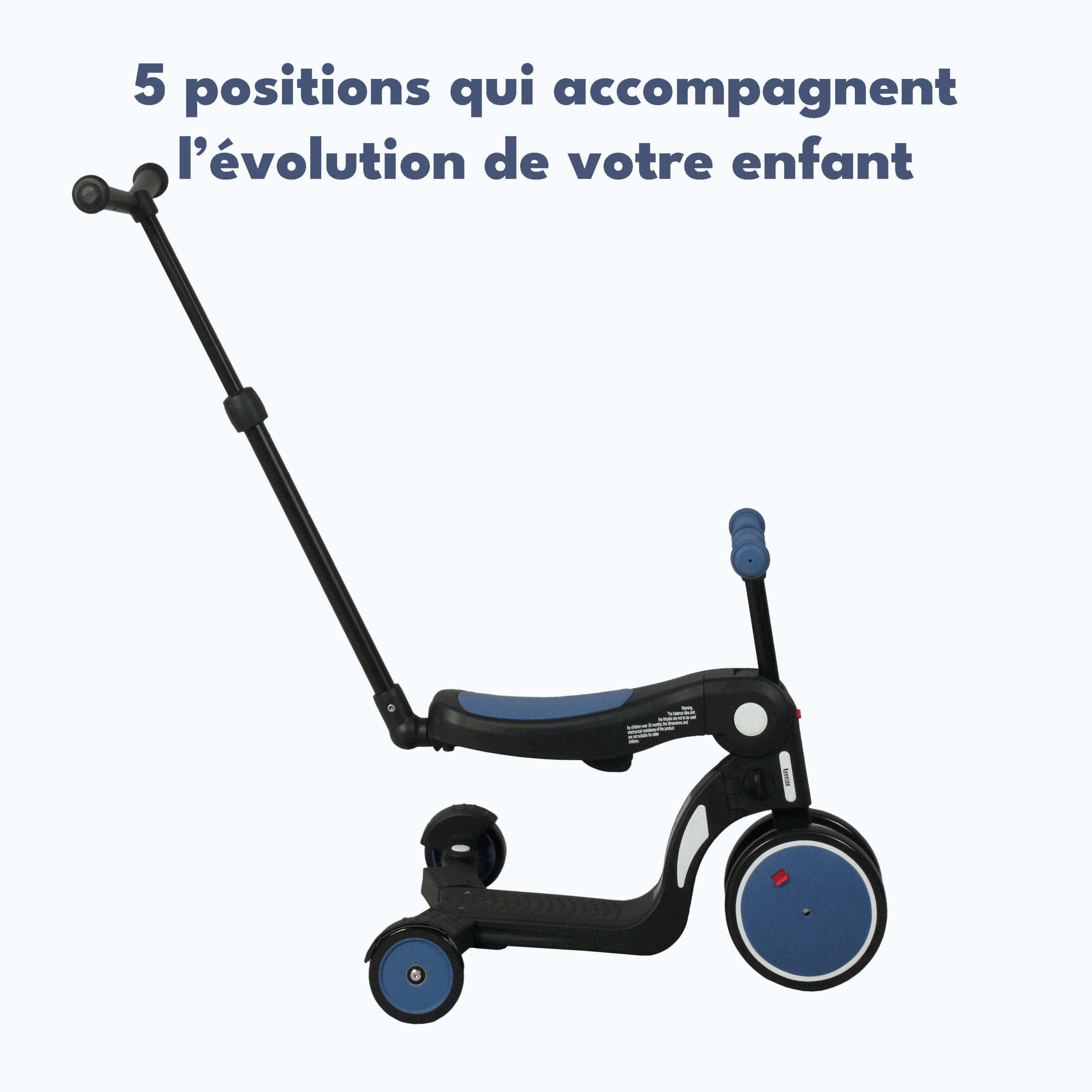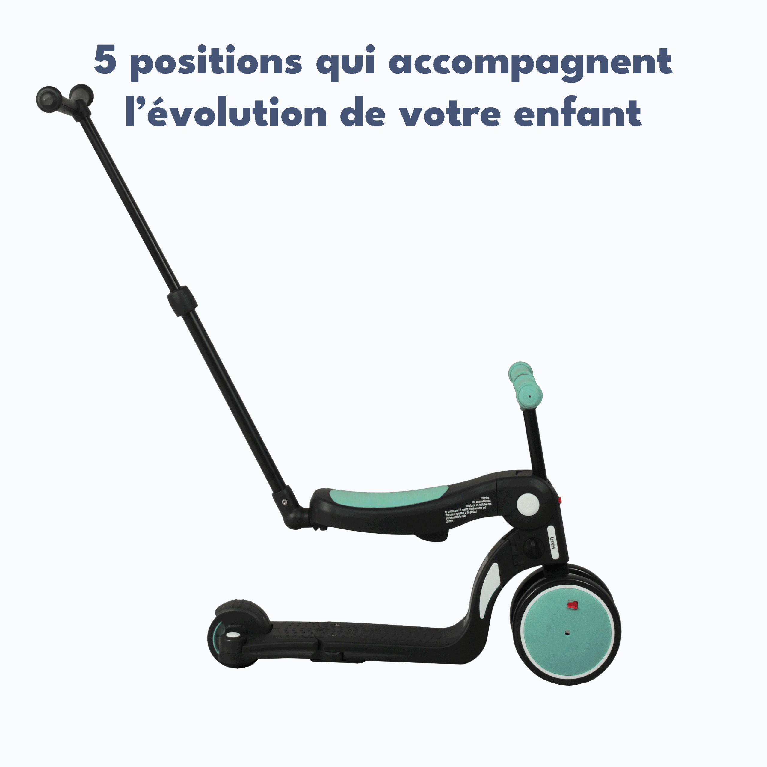 LOOPING Draisienne 5 en 1. Elle évoluera avec l’enfant de ses 1 ans à ses 50kg, Draisienne 2 ou 3 roues, Tricycle, Trotinette 3 ou 2 roues… il y a même un compartiment pour ranger les pédales afin de ne pas les perdre quand on les retire. La seule draisienne évolutive du marché avec une barre de poussée directionelle qui permet de choisir qui gère la direction (enfant ou parent) grâce à une molette qui bloque la rotation des roues avant.