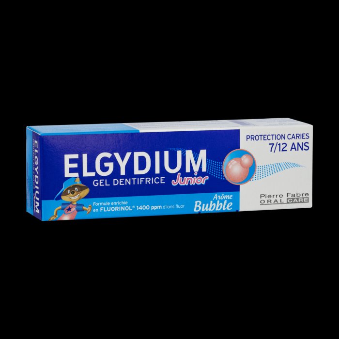 ELGYDIUM Junior Bubble Dentifrice 7 à 12 ans contient la juste dose de fluor, nécessaire à la santé des premières dents définitives.