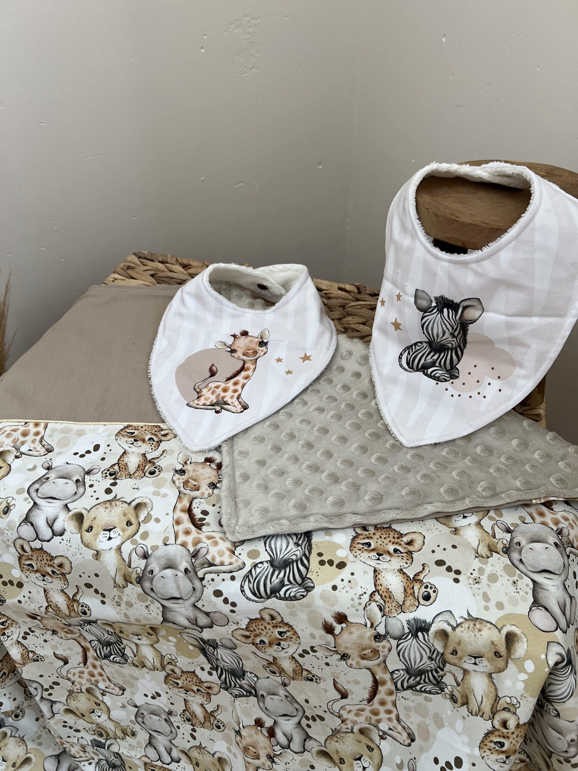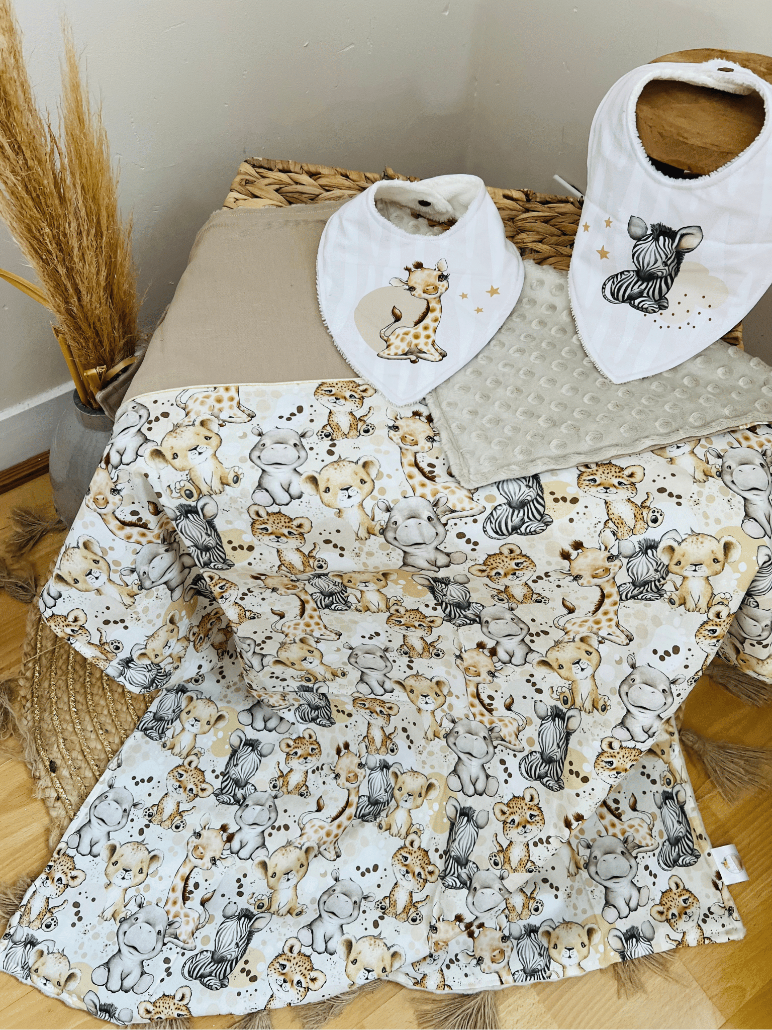 🐘 Ensemble bébé Safari – Plaid tout doux & 2 bavoirs assortis