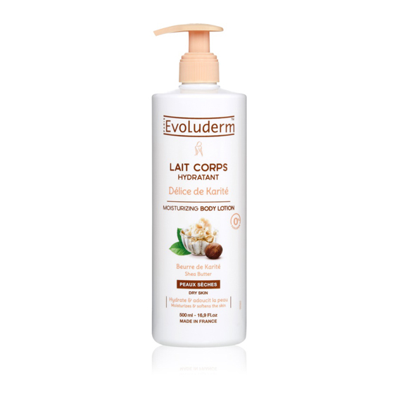 - Application : Appliquez le Lait Karité Evoluderm sur une peau propre et sèche.