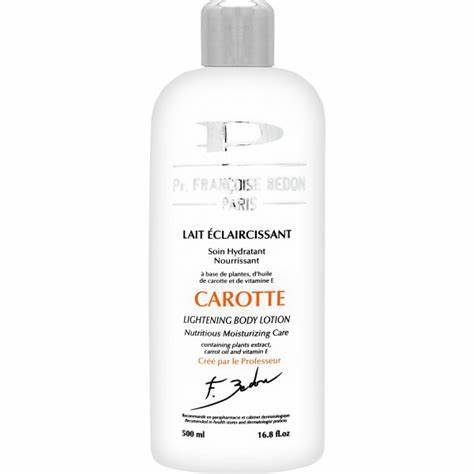 Le Lait Éclaircissant Carotte 500 ml du Professeur Françoise Bedon est un soin hydratant et nourrissant conçu pour unifier le teint et apporter de l’éclat à la peau. Enrichi en extraits de plantes, en huile de carotte et en vitamine E, il aide l’épiderme à mieux lutter contre les agressions extérieures.