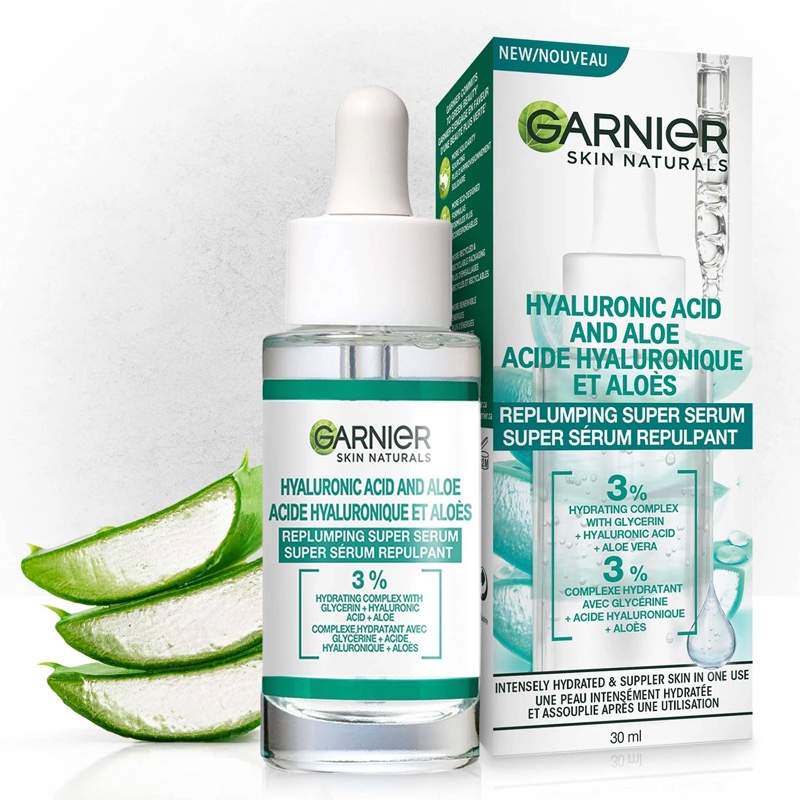 Le premier sérum de Garnier hyaluronique pour repulper visiblement, booster l’hydratation et l’éclat! Un sérum au complexe hydratant 3% de Glycérine + Acide Hyaluronique + Aloe Vera. Il repulpe, hydrate intensément et assouplit la peau en une seule utilisation ! L’acide hyaluronique pur et repulpant retient jusqu’à 100x son poids en eau. L’aloe vera est bien connu pour ses propriétés rafraîchissantes et super désaltérantes. la peau est plus douce, hydratée et paraît plus saine. Après un mois d’utilisation, la peau est repulpée, plus lisse et éclatante de santé.