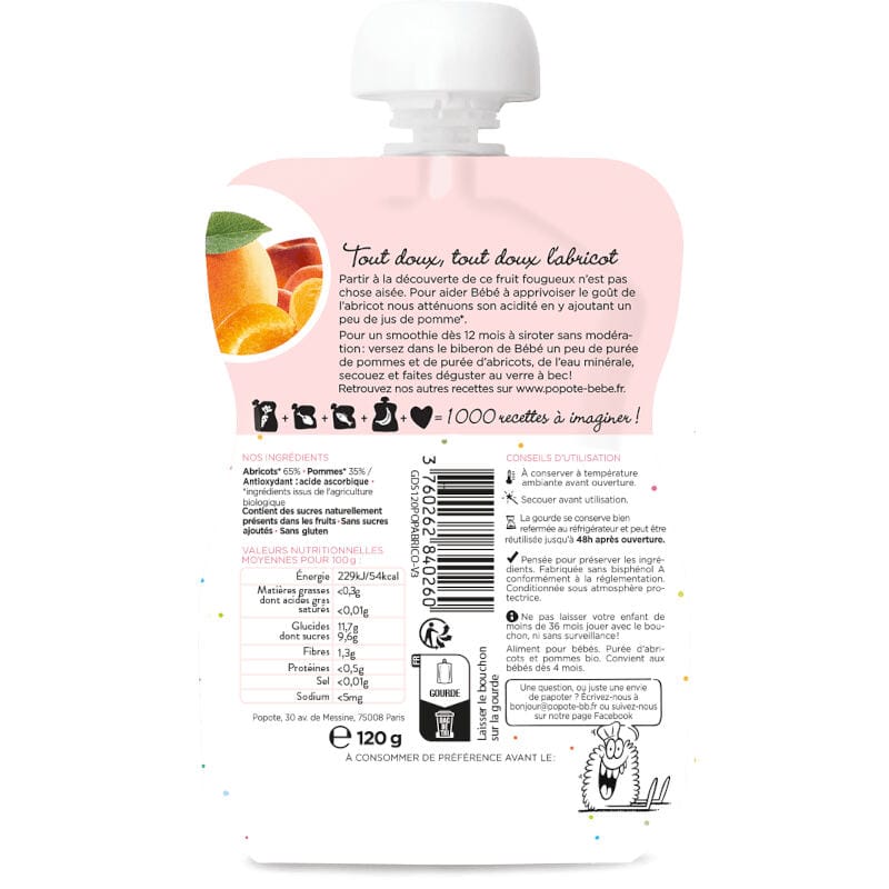 À la découverte de l’abricot doux: la gourde abricot de Popote invite Bébé à s’ouvrir au monde des saveurs. Parfaite pour introduire l’abricot avec un équilibre délicat, la recette utilise uniquement des fruits bio, mûris au soleil et récoltés à la main. Idéal pour la diversification alimentaire dès 4/6 mois. Bio: 100% ingrédients issus de l’agriculture biologique Sans gluten Sans sucres ajoutés Fabriqué en France