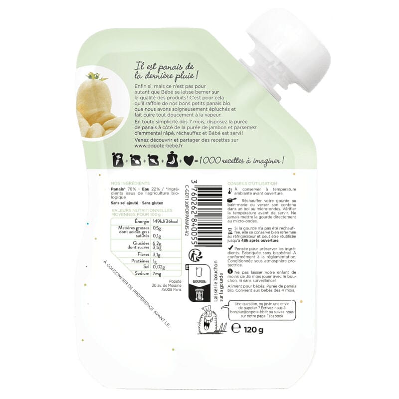 Avez-vous déjà essayé un petit pot de panais pour bébé ? Non ? C’est normal, car il n’y en a pas beaucoup ! Sauf chez Popote… Ce légume étonnant va sûrement plaire aux bébés ! Et aux parents aussi !Le panais est doux et légèrement sucré, tout comme la patate douce, ce qui en fait une purée originale pour la diversification alimentaire de bébé dès 4/6 mois. Bio: 100% ingrédients issus de l’agriculture biologique Fabriqué en France