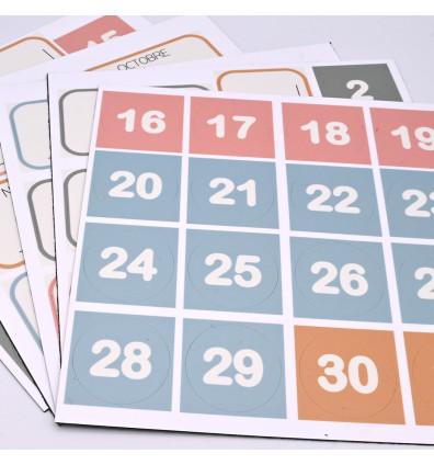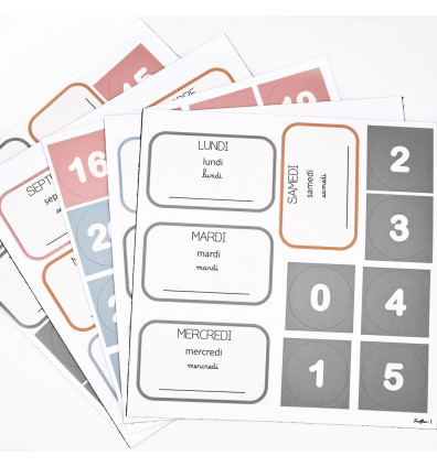 • 5 planches composé de 50 magnets : 7 magnets jours, 12 magnets mois et 31 magnets chiffres. Le plus : les enfants peuvent s’entrainer à écrire sur les étiquettes jours et mois avec un feutre à l’eau.