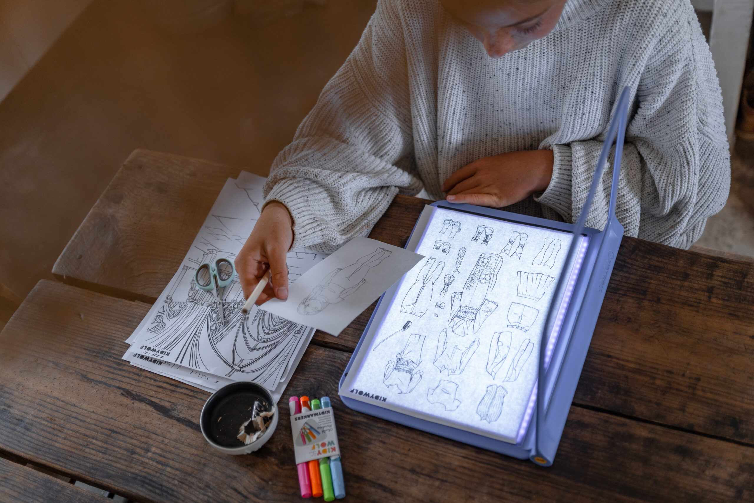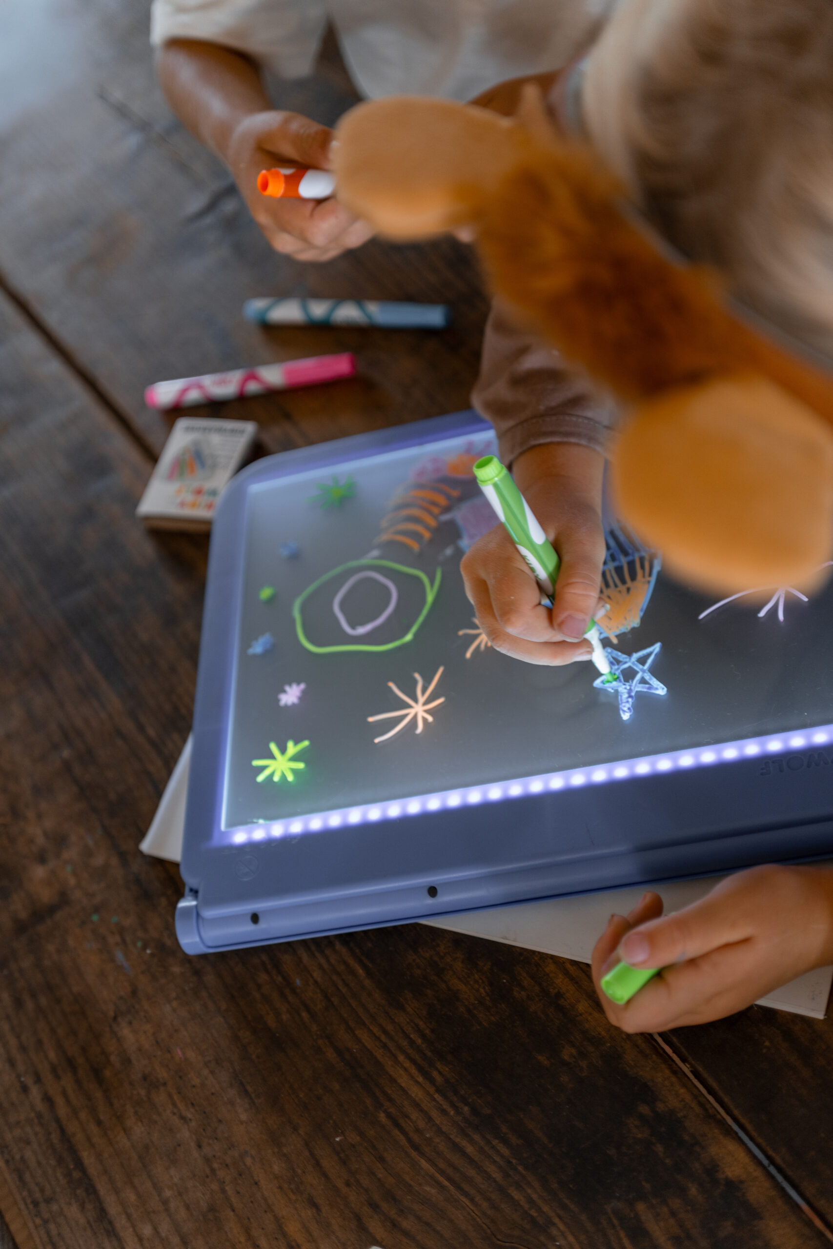 Kidywolf Une super tablette lumineuse à amener partout pour dessiner et apprendre à écrire. Les 2 faces vous permettent de développer la créativité de votre enfant : une face tableau noir effet néon qui fera ressortir les couleurs du dessin fait avec les feutres craie fournis une face tablette lumineuse permettant de décalquer un dessin