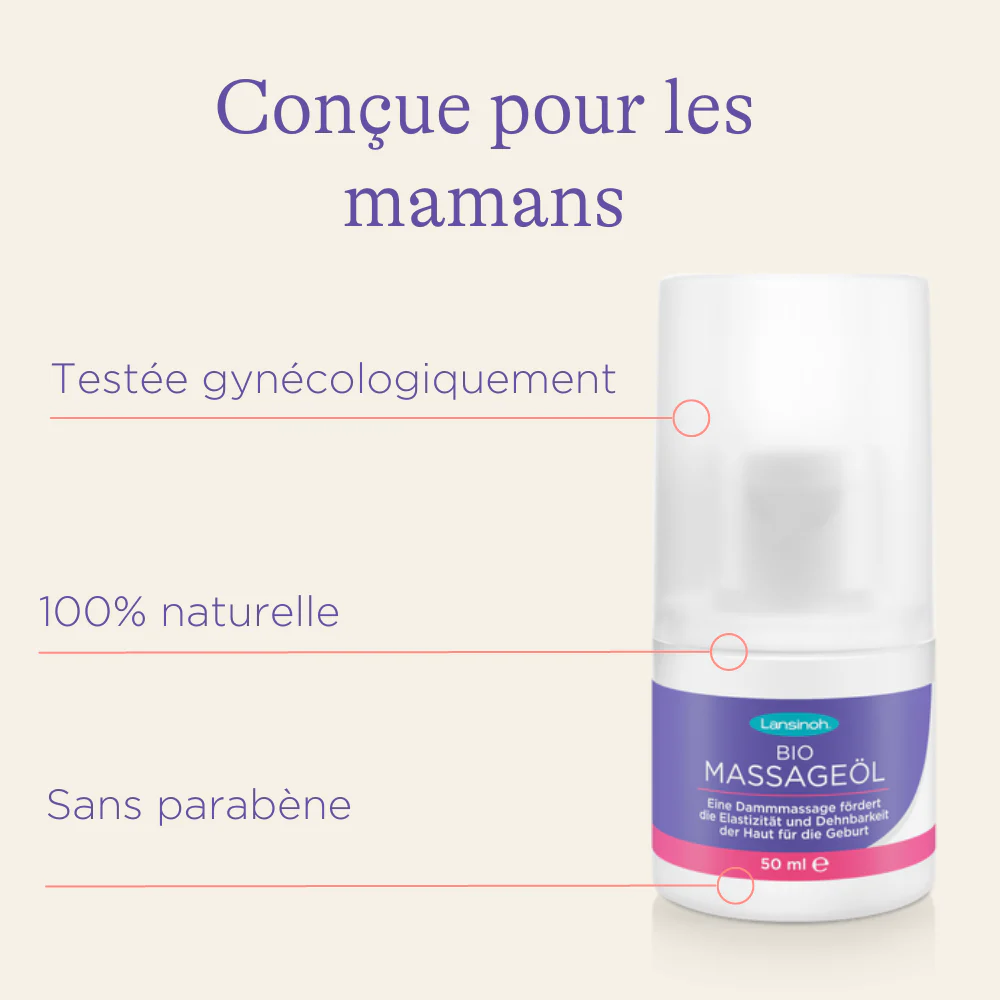 Plus la naissance approche, plus les futures mamans se demandent : Comment puis-je mieux préparer l’accouchement ? Les sages-femmes recommandent d’effectuer des massages périnéaux à partir de la 34e semaine de grossesse . Grâce à ce massage, la future maman peut se préparer physiquement et mentalement à l’accouchement. Il a été prouvé qu’un massage de la zone du périnée favorise l’élasticité des tissus et prévient ainsi les déchirures périnéales. L’huile de massage du Périnée BIO Lansinoh® a été spécialement développée pour une utilisation sur le périnée et a été testée cliniquement et gynéco logiquement.