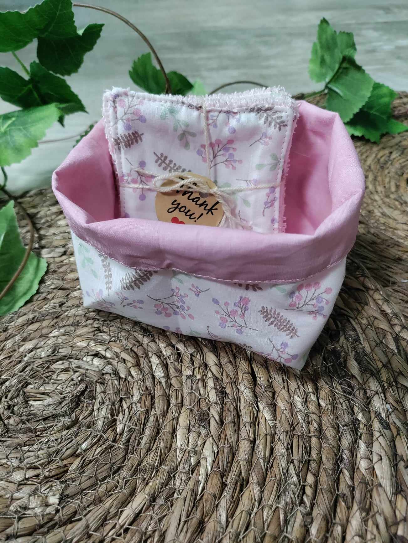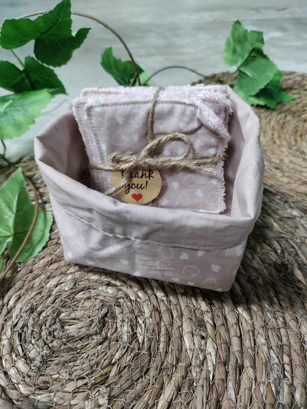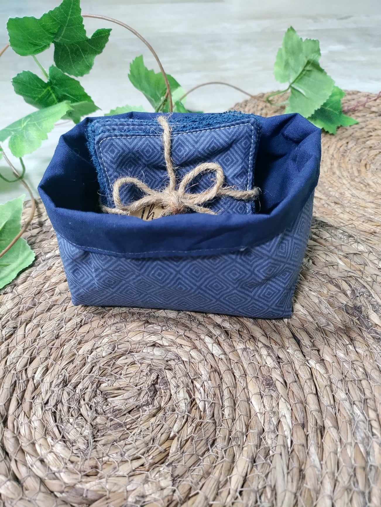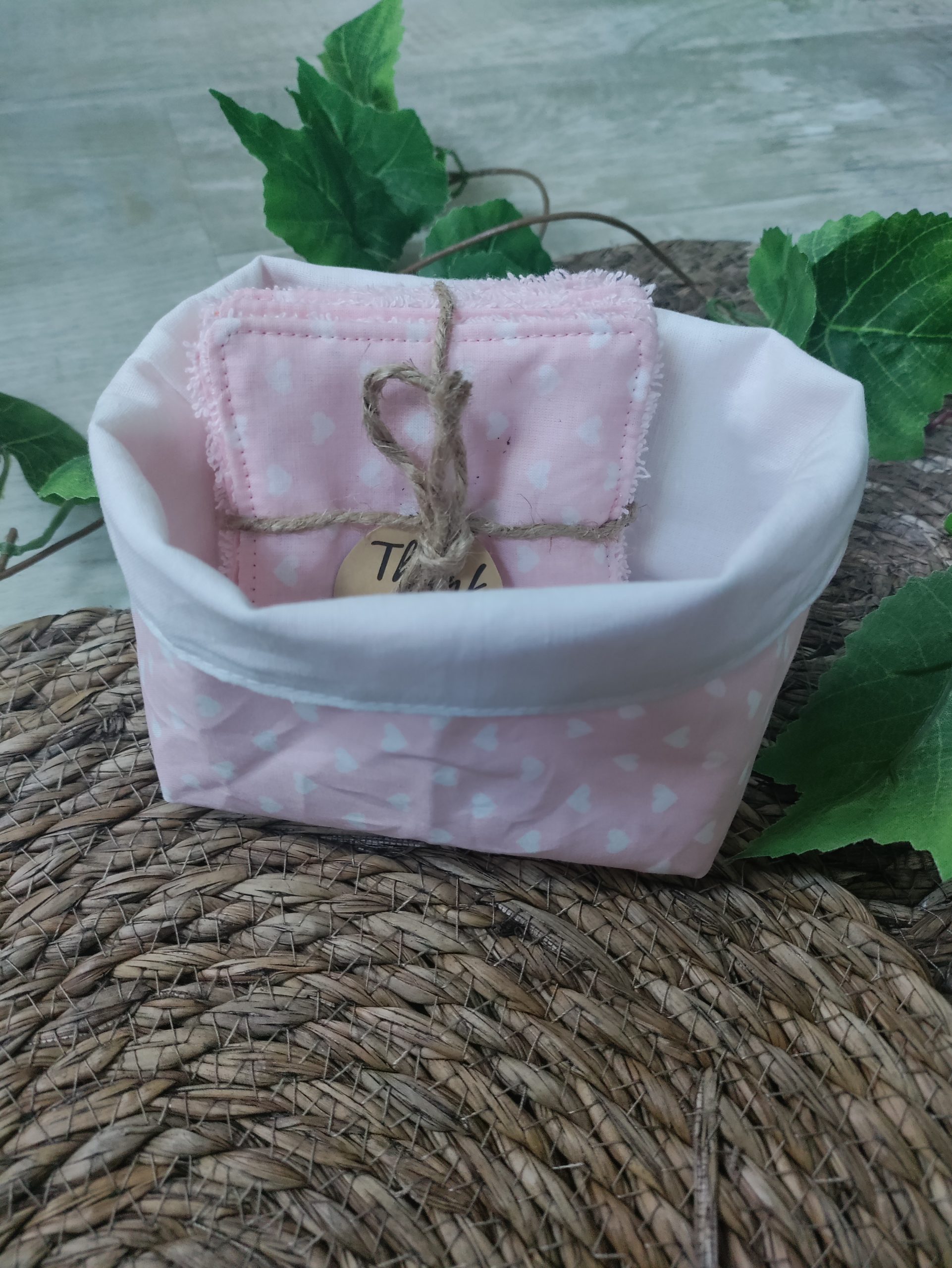 Ces lingettes sont joliment rangées dans une panière souple de 10x10cm assortie en coton. Vous pouvez retourner le tissu afin de changer le style de votre panière.