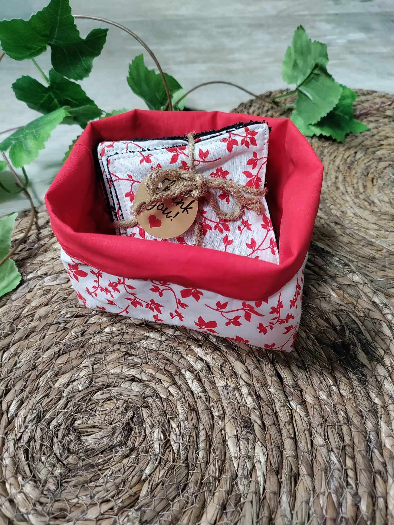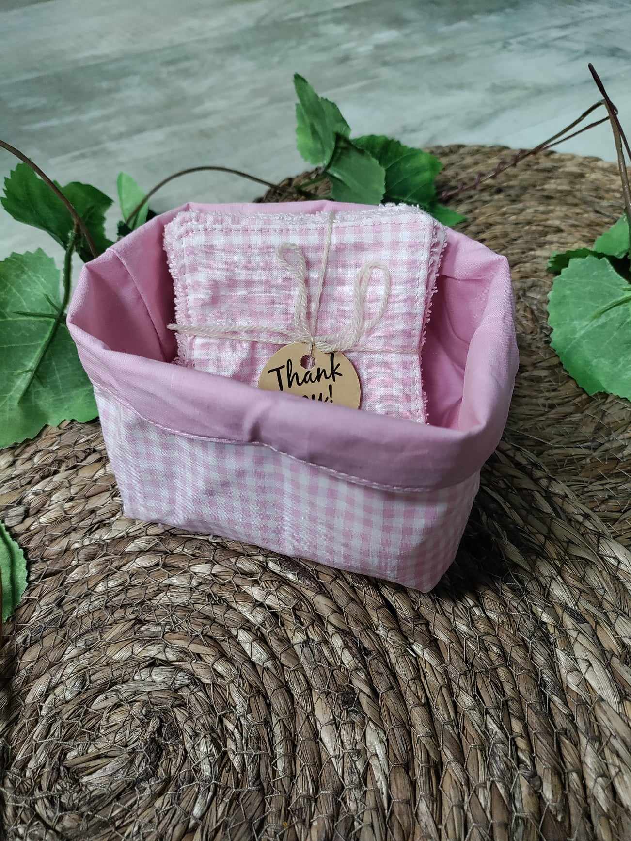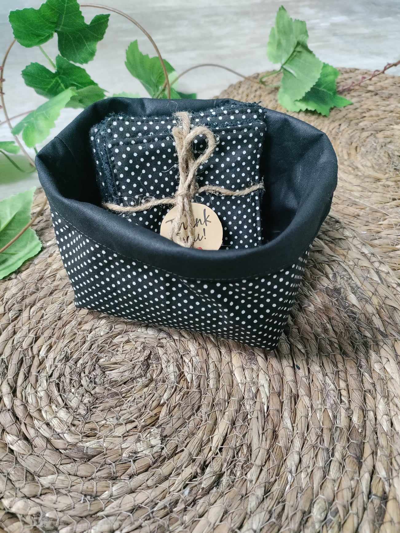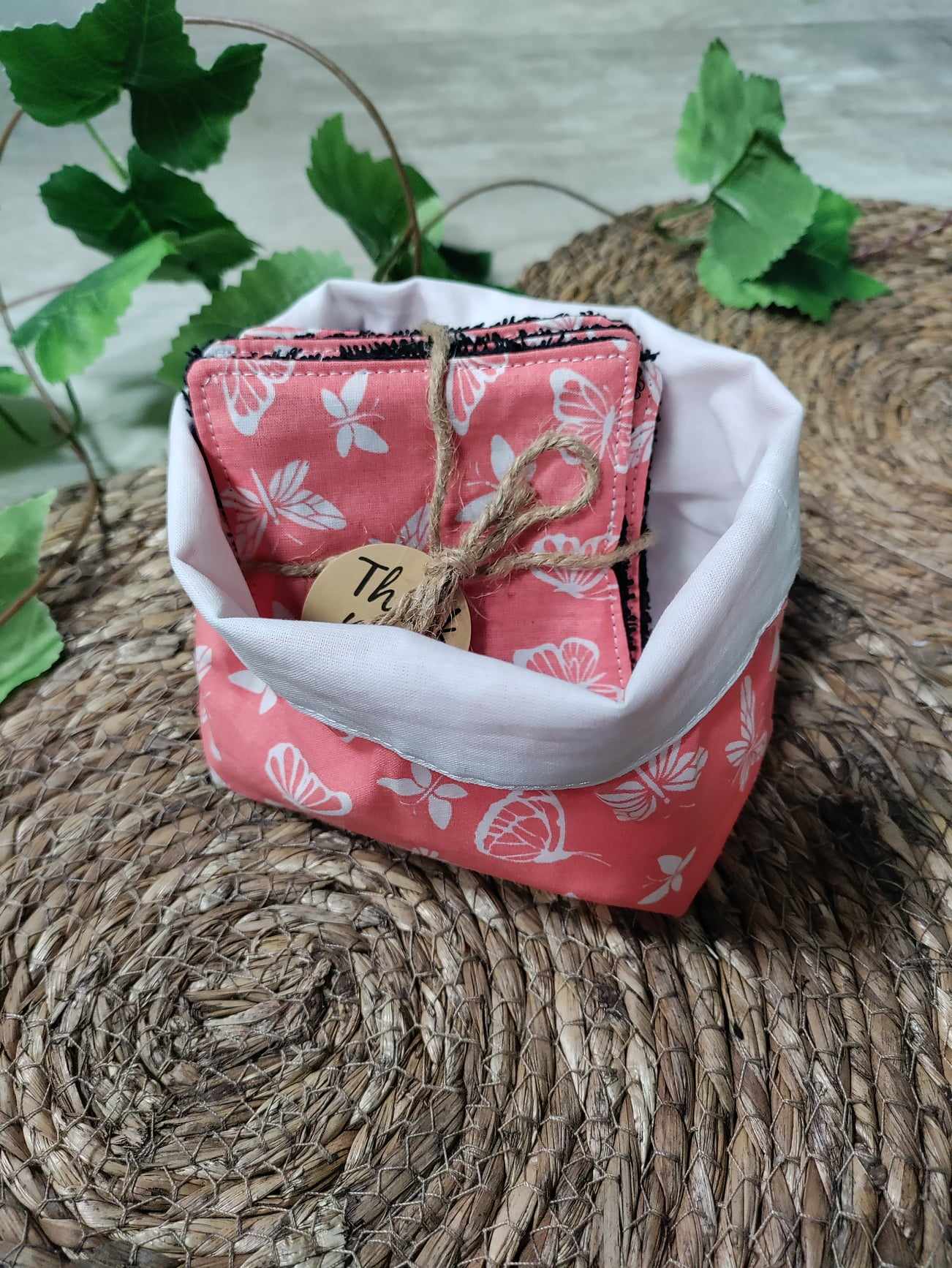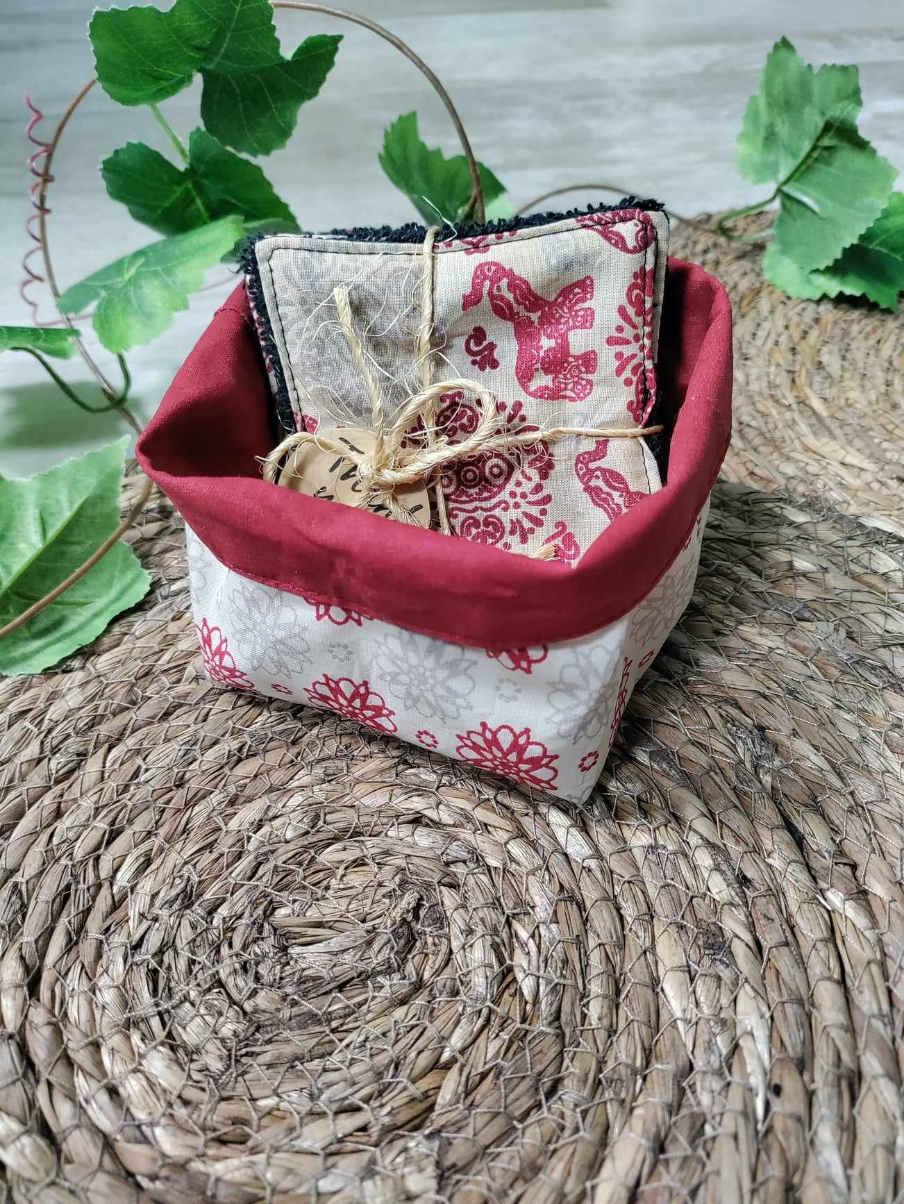 Ces lingettes sont joliment rangées dans une panière souple de 10x10cm assortie en coton. Vous pouvez retourner le tissu afin de changer le style de votre panière.