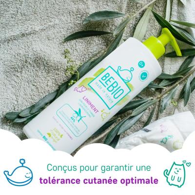 Le liniment Bebio est un soin complet pour bébé, nettoyant, apaisant, nourrissant et protecteur. Enrichi en huile d’olive bio et en cire d’abeille, il calme les irritations, nourrit la peau et la protège des érythèmes fessiers. Certifié Cosmos Ecocert, il convient dès la naissance. Fabriqué en Belgique, il est sans paraben, sans phtalate et sans phenoxyethanol.
