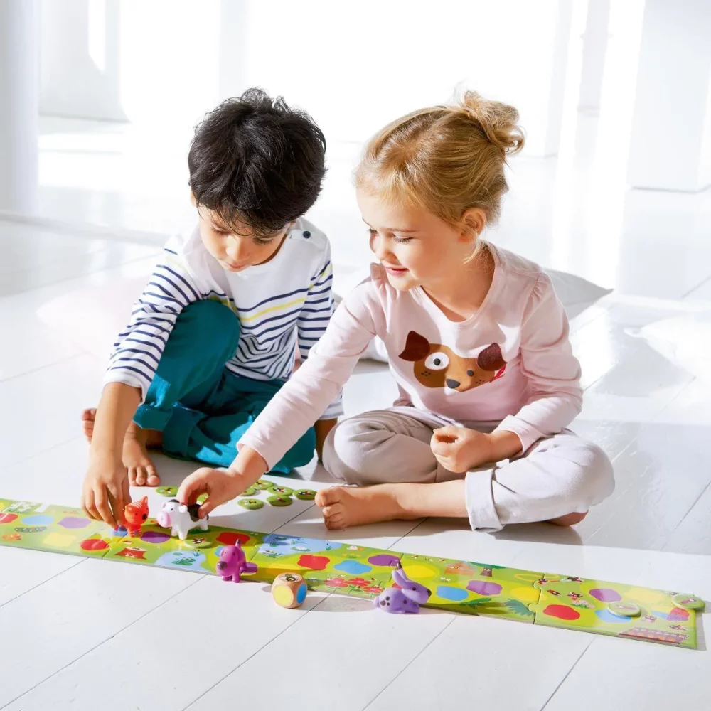 4 animaux très mignons sont sur la ligne de départ. Le premier joueur lance le dé et avance son animal jusqu’à la case de la couleur annoncée par le dé. Le premier arrivé gagne un jeton.