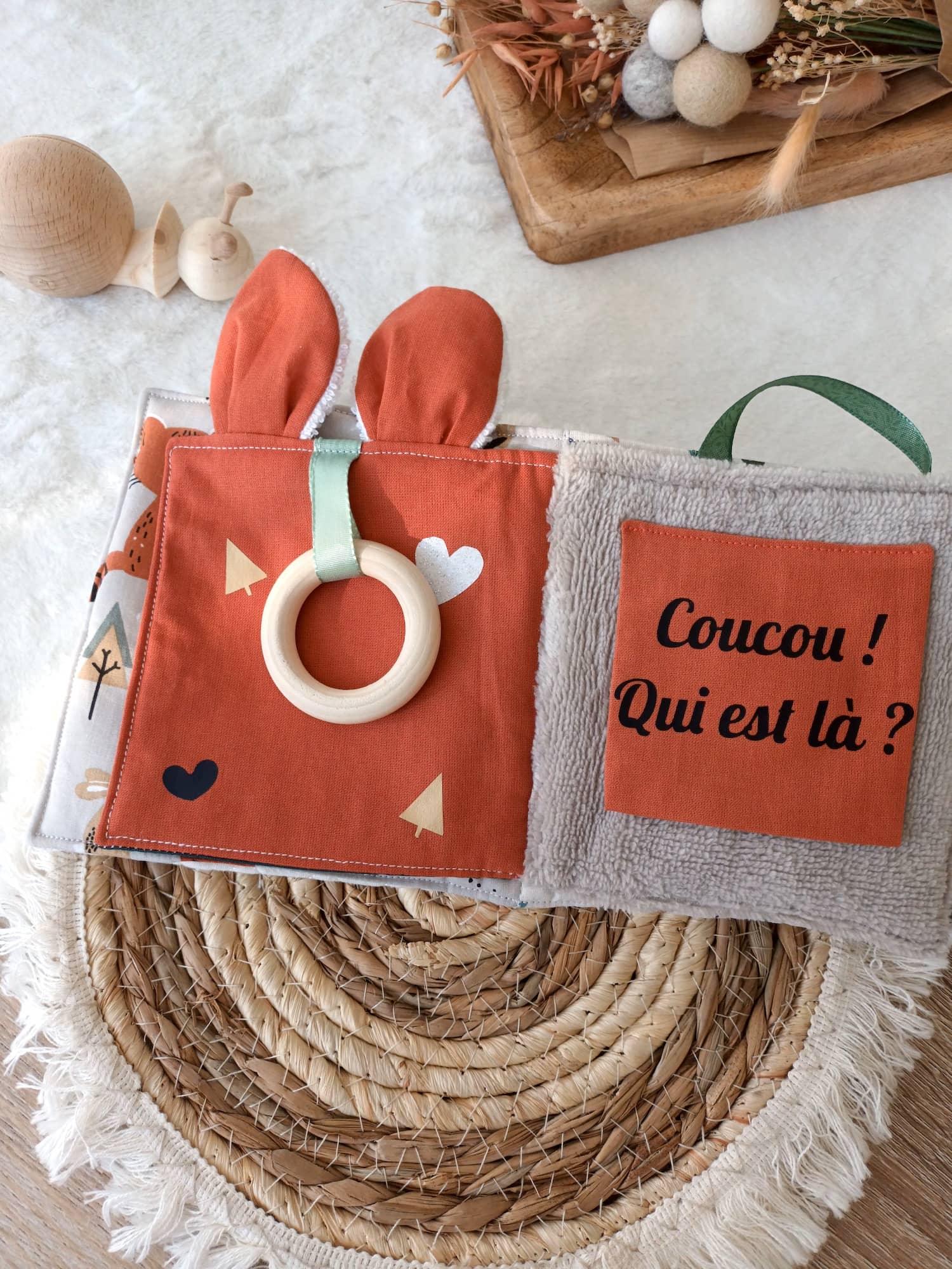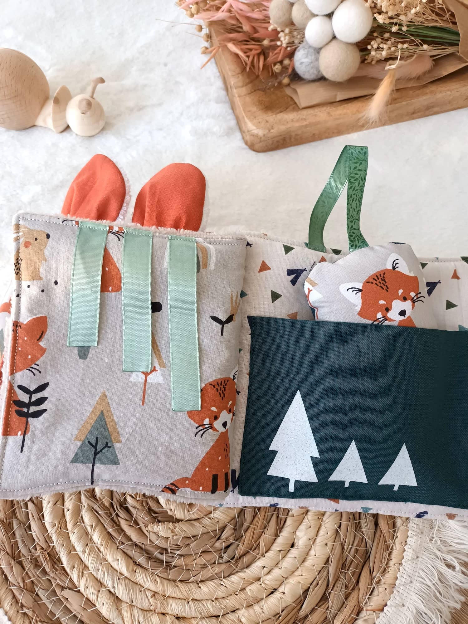 Pour développer les sens de bébé et l’amuser au fils des pages Le livre d’éveil est réalisé avec plusieurs tissus de différentes matières toutes certifié OEKO TEX Convient dès la naissance Anneau en bois naturel non traité Idéal pour les premières dent de bébé Chaque modèle est unique