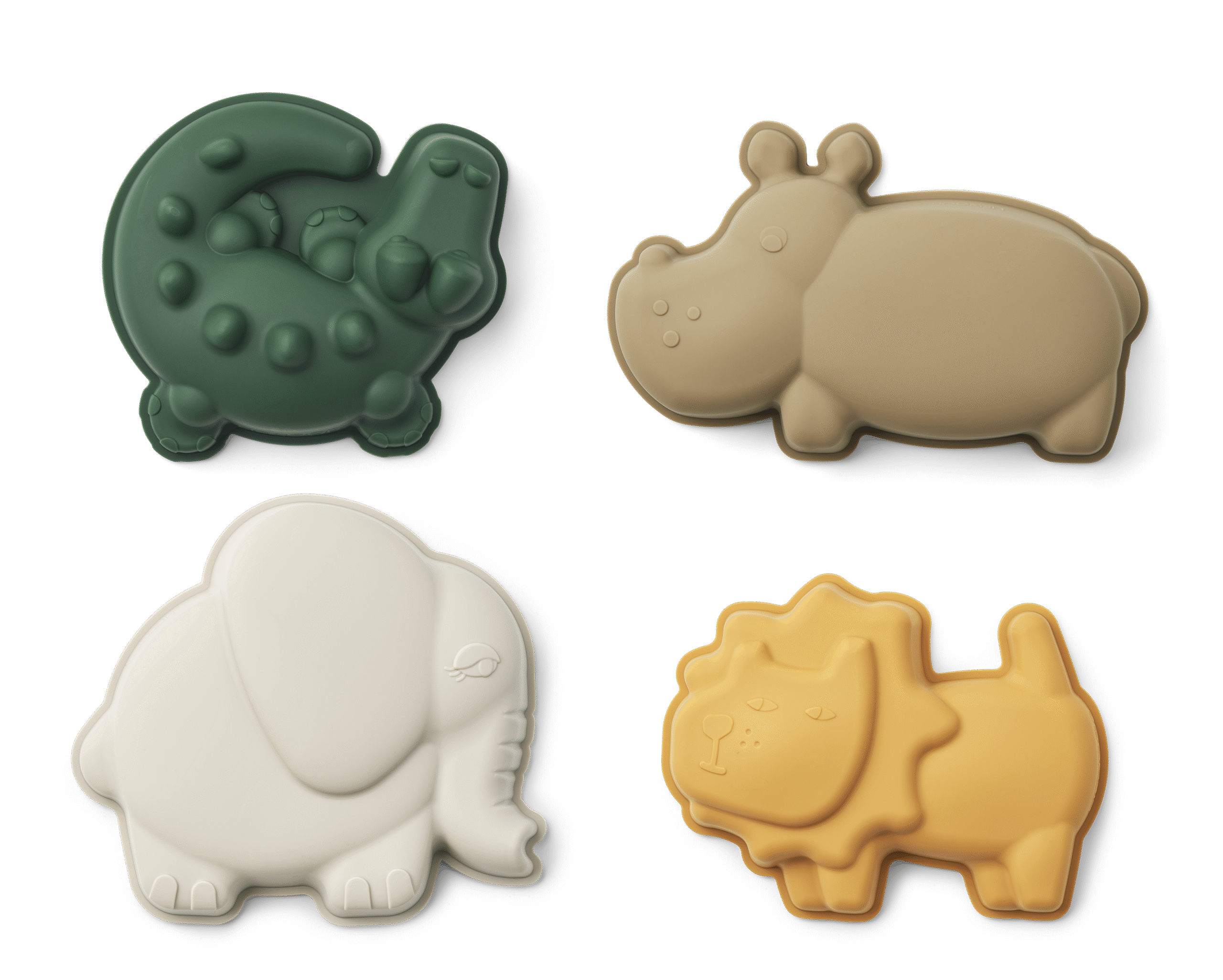 LIEWOOD Les animaux de la savane en Moules pour le sable c’est incroyable ! Un éléphant, un crocodile, un hippopotame et un lion !!! Les moules sont en silicone et seront autant utilisés pour le sable sur la plage ou au parc ou pour le bain.