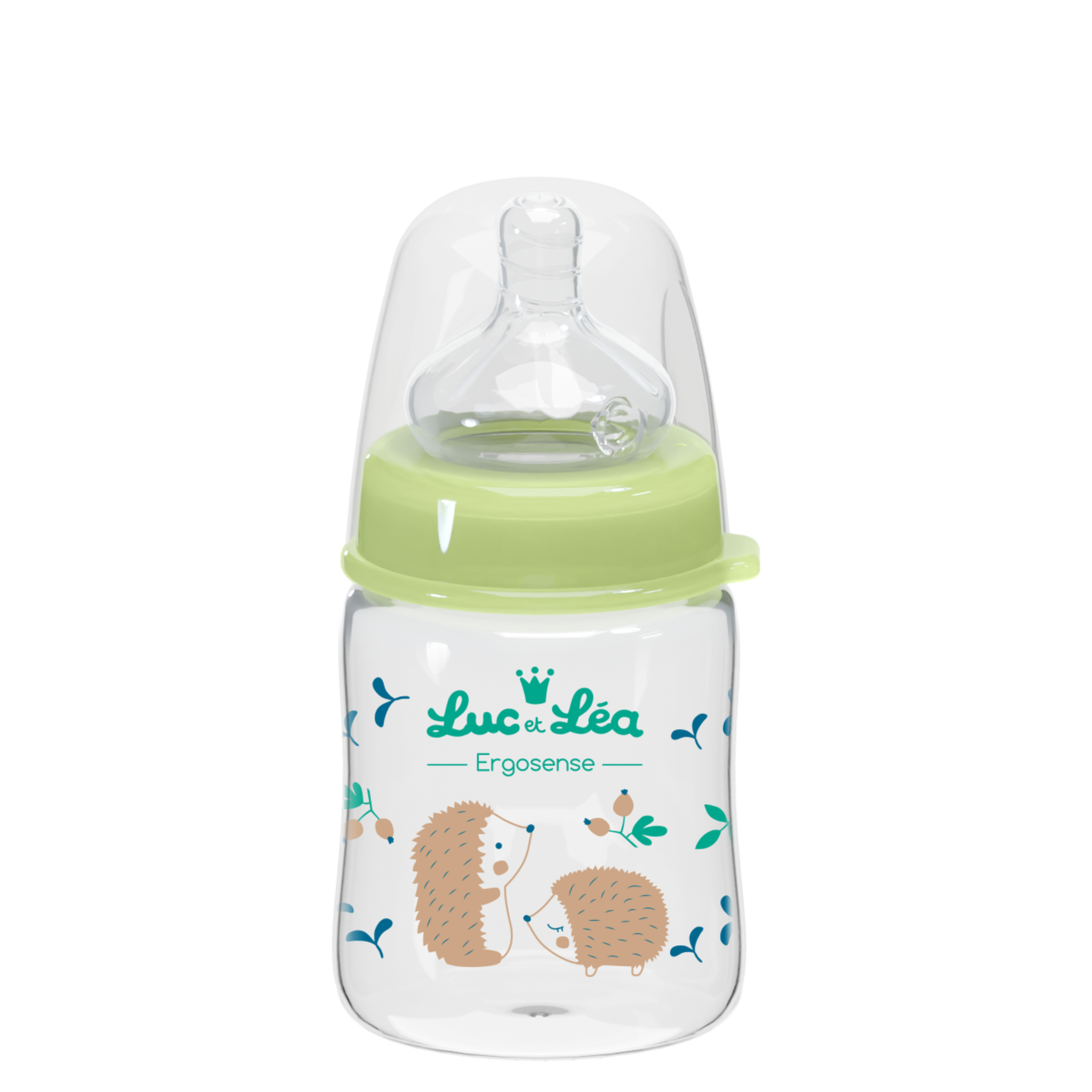 Le biberon Luc et Léa de 120ml est fabriqué en verre borosilicate, reconnu pour sa résistance à la chaleur et aux chocs thermiques. Il est équipé d’une tétine en silicone souple anti-colique, limitant les risques d’aérophagie.