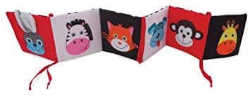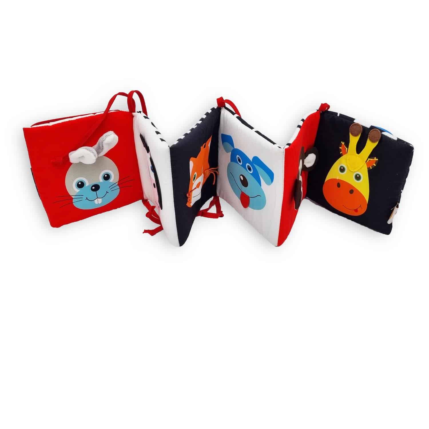 Ce livre doux, facile à saisir se déploie pour montrer à bébé des formes géométriques en noir et blanc à forts contrastes d’un côté et des animaux souriants de l’autre.