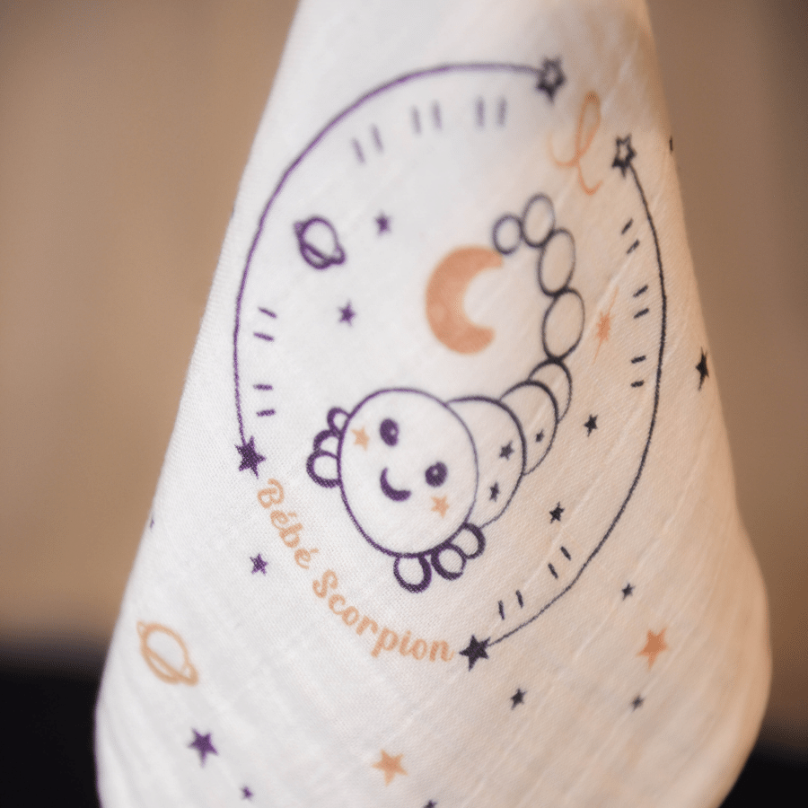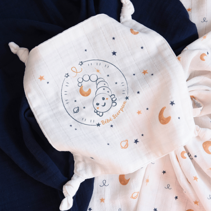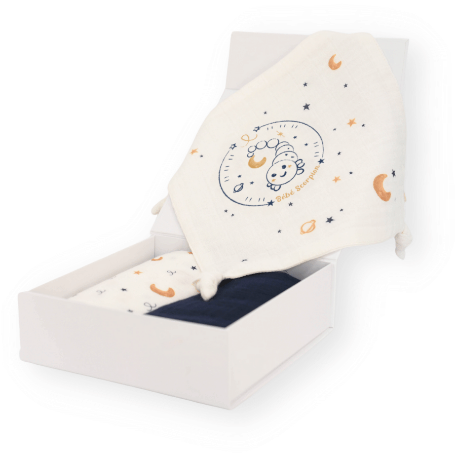 Tom & Mila Né entre le 23 octobre et le 22 novembre, Bébé Scorpion est audacieux, joueur et tendre. Arrêtez tout ! Bébé Scorpion est là ! Ce petit coquin a plus d’un tour dans son sac pour attirer votre attention et se faire câliner. Cadeau de naissance original, le coffret astro. Utile : le coffret comprend deux langes (on n’en a jamais assez) et un doudou pouvant s’accrocher à la tétine ou à l’anneau de dentition. Beau : les dessins ont été réfléchis pour adapter les signes du zodiaque au monde de nos Mini.e.s Certifiés Oeko-Tex, les produits respectent la peau…