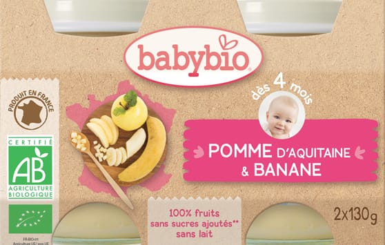 Le petit pot pommes – bananes est une purée de fruits 100% bio, sans sucres ajoutés, sans gluten et sans protéine de lait, dès 4 mois. Disponible en pack de 2 x 130 g (pot en verre).