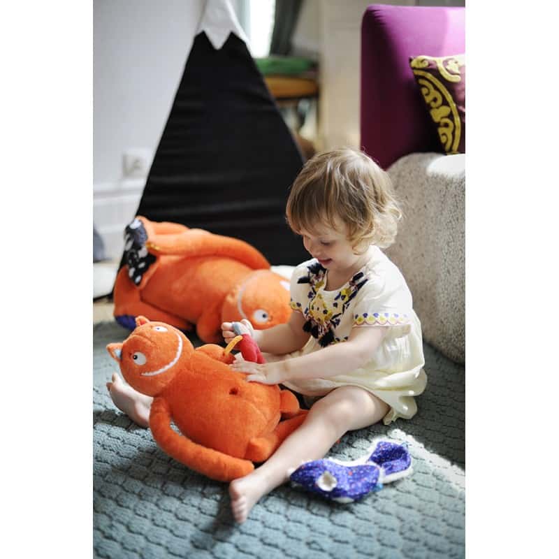 Le petit personnage qui l’accompagne est une marionnette de doigt que les parents peuvent enfiler pour le faire interagir avec son ami le Géant. Il se range aussi dans la poche cachette du Géant qui se trouve sur le côté de son gros ventre.