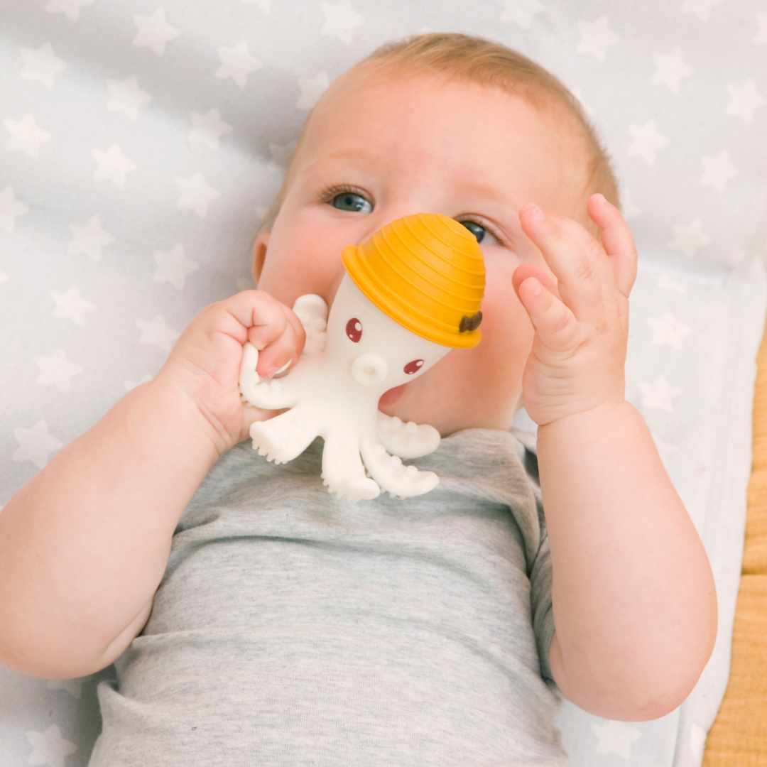 Ce joli jouet de dentition “Bonnie la pieuvre” soulagera votre enfant lors de ses poussées dentaires. Ses 8 tentacules proposent un côté brosse et un côté picots et son chapeau quant à lui strié, permettra un soulagement efficace des gencives sensibles.