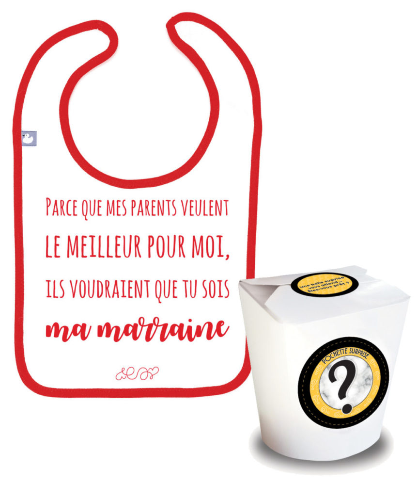 Les surprises « spéciales annonces » Les plus belles annonces méritent les plus jolies surprises ! Vous souhaitez annoncer votre grossesse à votre entourage de manière ludique et originale ou encore faire votre demande officielle aux futurs parents ou à la future marraine ? Offrez-leur une pochette surprise et laissé un souvenir impérissable ! Chaque boîte mystérieuse contient un joli bavoir en pur coton avec le message correspondant à votre annonce, vous pourrez ainsi l’utiliser plus tard avec bébé ou le conserver en souvenir.