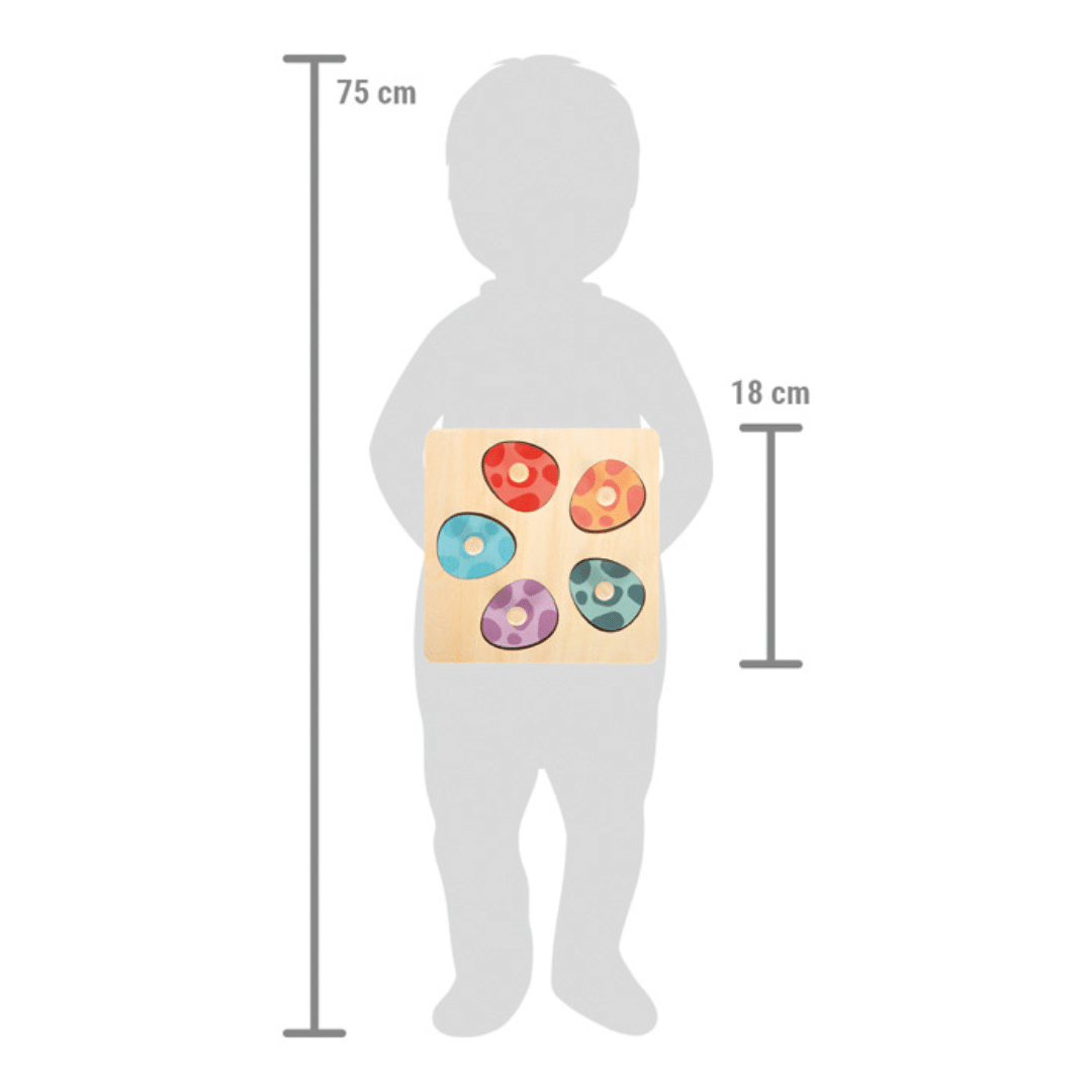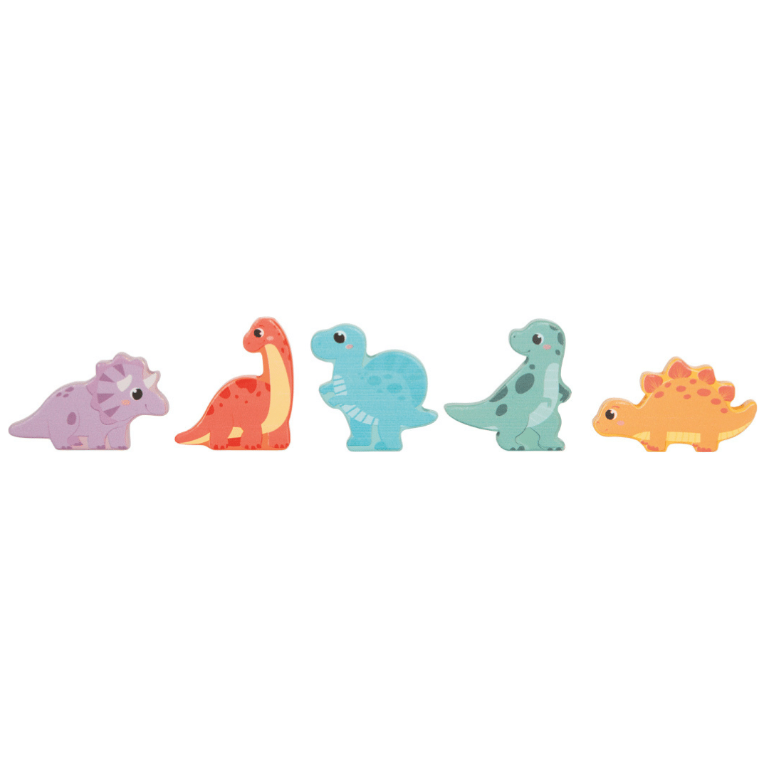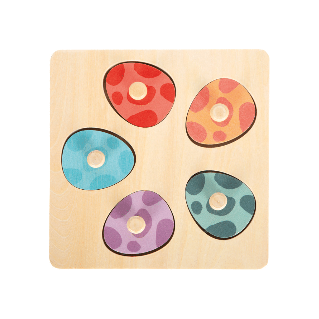 Ce puzzle en bois est composé de 6 œufs de dinosaures colorés, chacun associé à une figurine de dinosaure assortie.