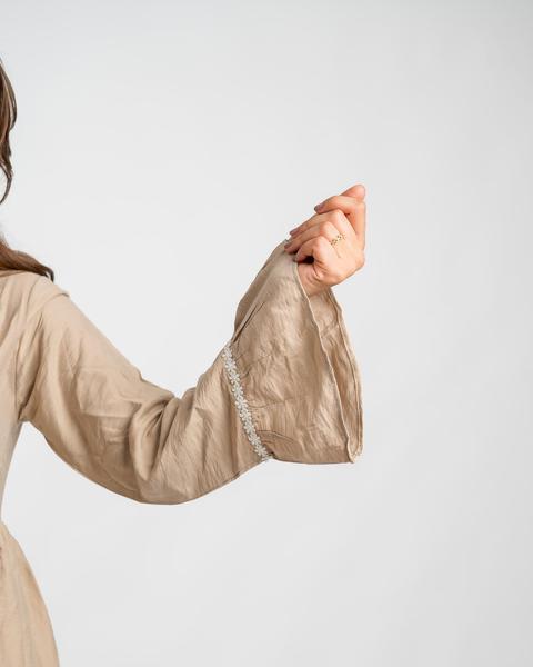 •Manches : Longues légèrement évasées avec galon de dentelle