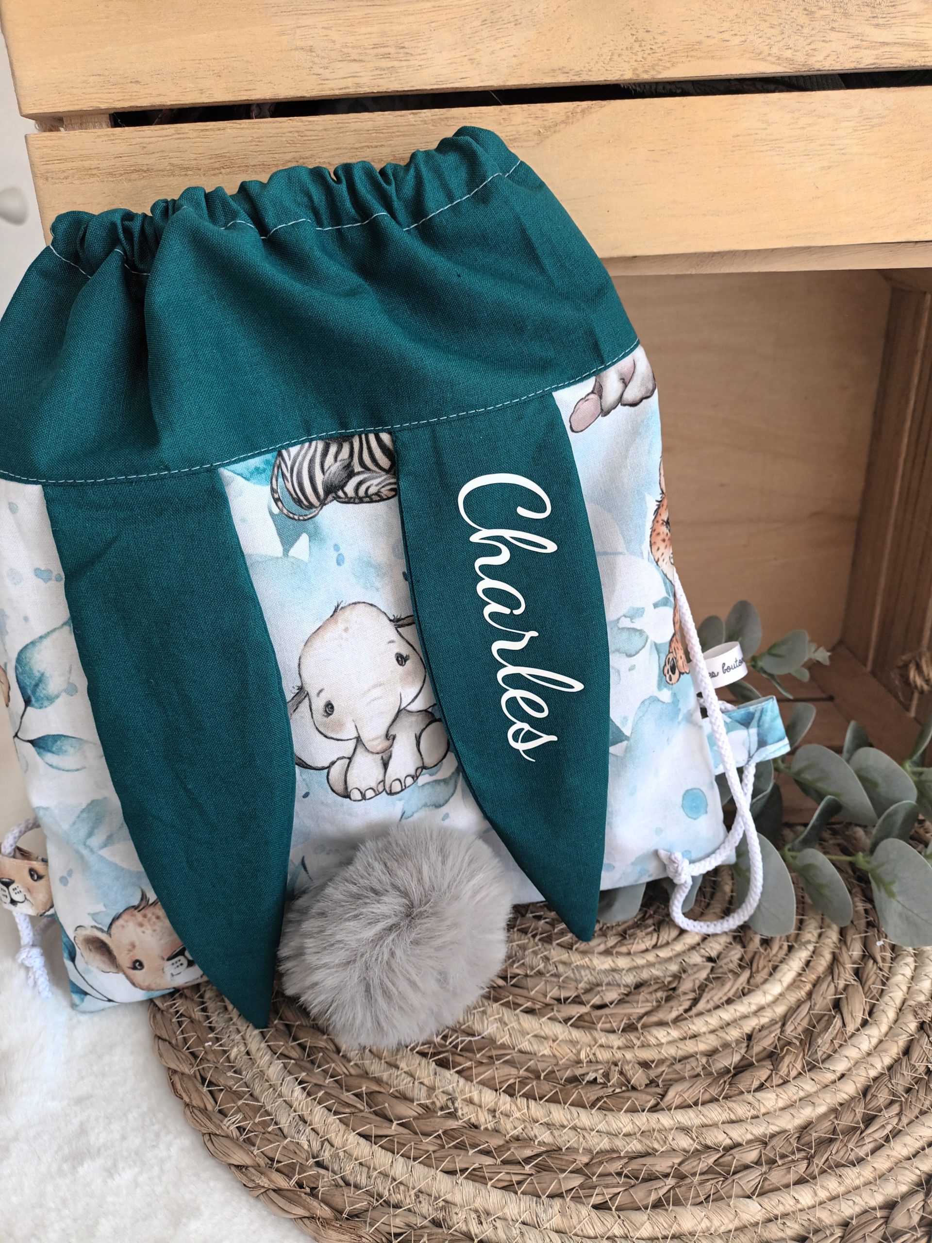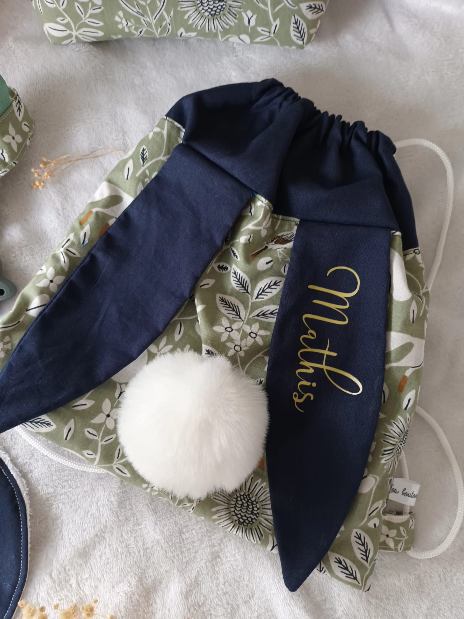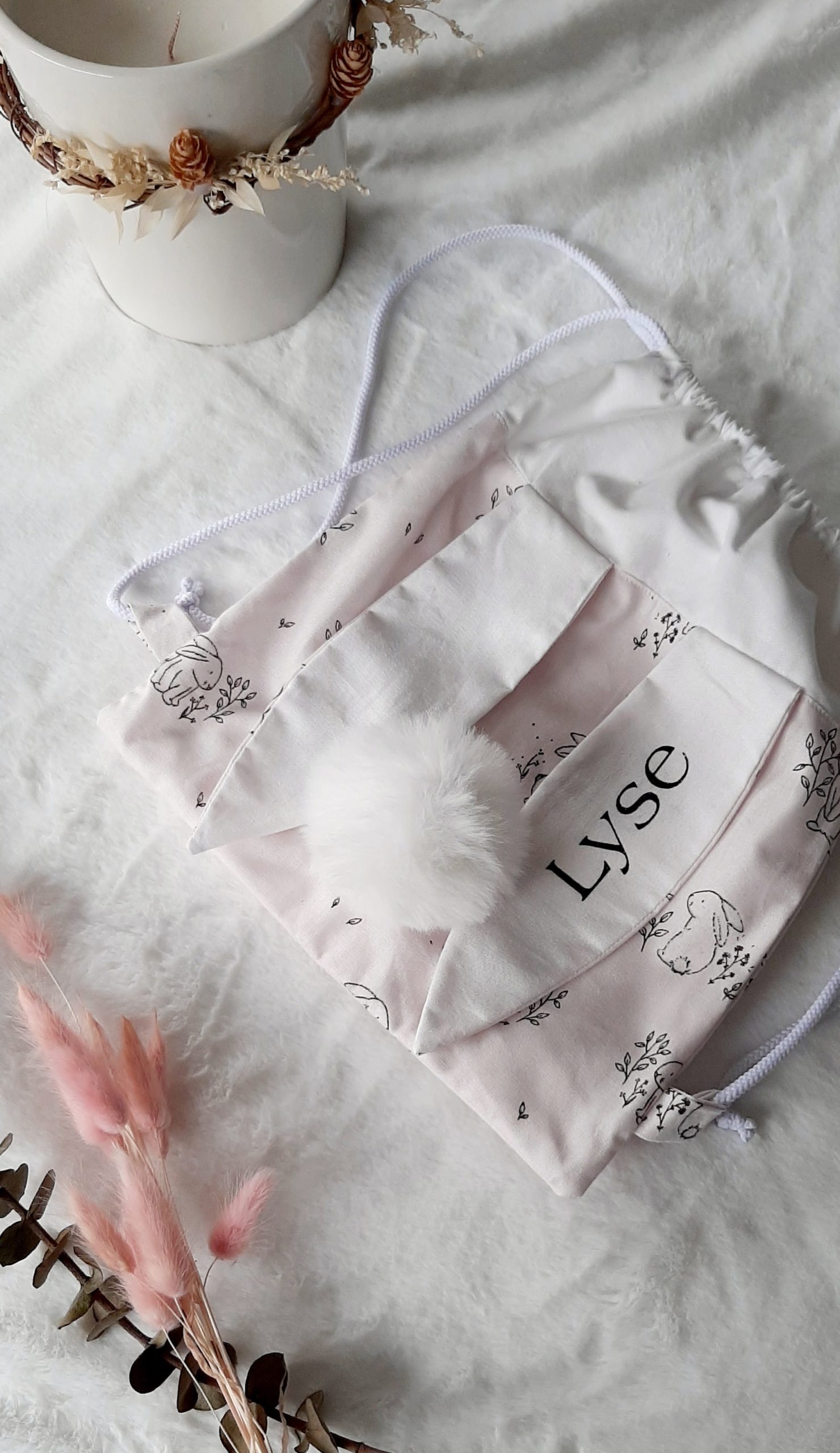 Idéal pour la crèche, la nounou ou l’école, sac baluchon avec oreille de lapin pour ranger les affaires de change, doudou, gourde… Pour un rendu harmonieux, le tissu uni sera choisi en fonction du tissu à motif sélectionné, pour toute demande particulière merci de me le signaler en commentaire lors de la commande. Tissu 100% coton certifié OEKO TEX