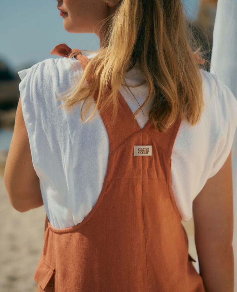 Légère, tendance et ultra confortable, la salopette short de maternité Éloïse abricot de chez Cache Cœur accompagne votre ventre rond avec douceur et style tout au long de la grossesse… et même après !
