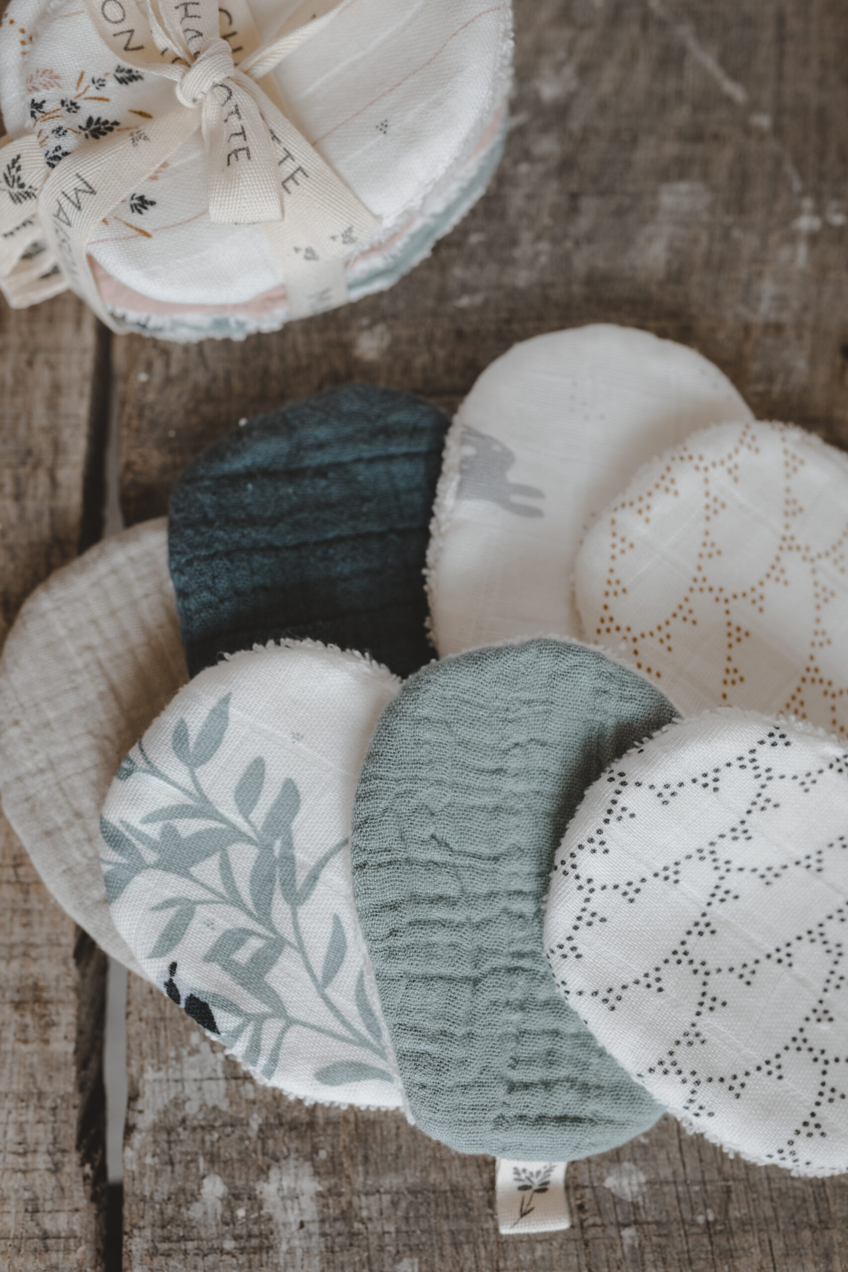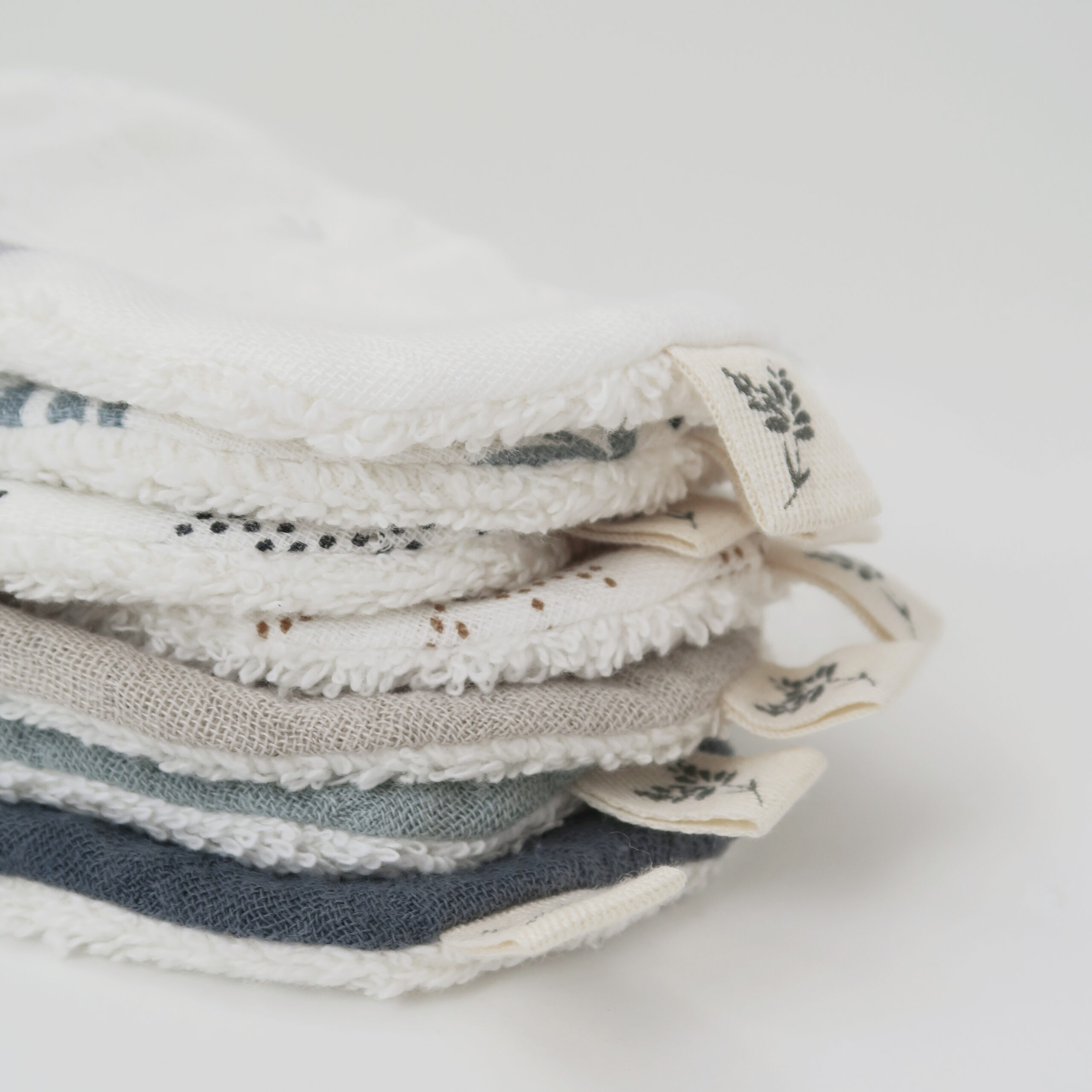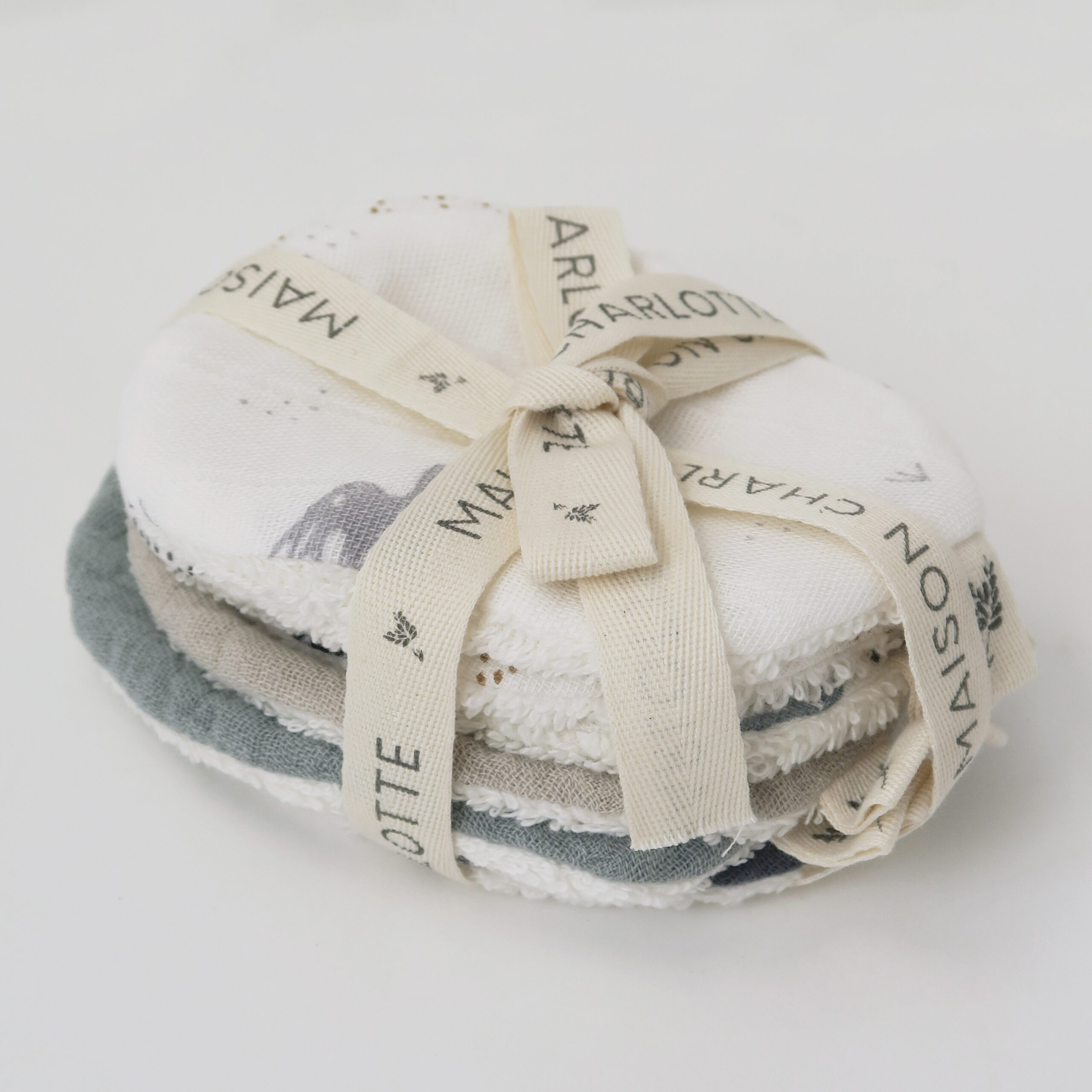 Maison Charlotte 7 lingettes lavables 100% coton pour, démaquiller, débarbouiller, changer nettoyer bébé en douceur. Idéales pour une toilette quotidienne sans déchets. un côté gaze de coton et un côté éponge en coton bio. Attachées avec un ruban c’est une bonne idée de cadeau de naissance.