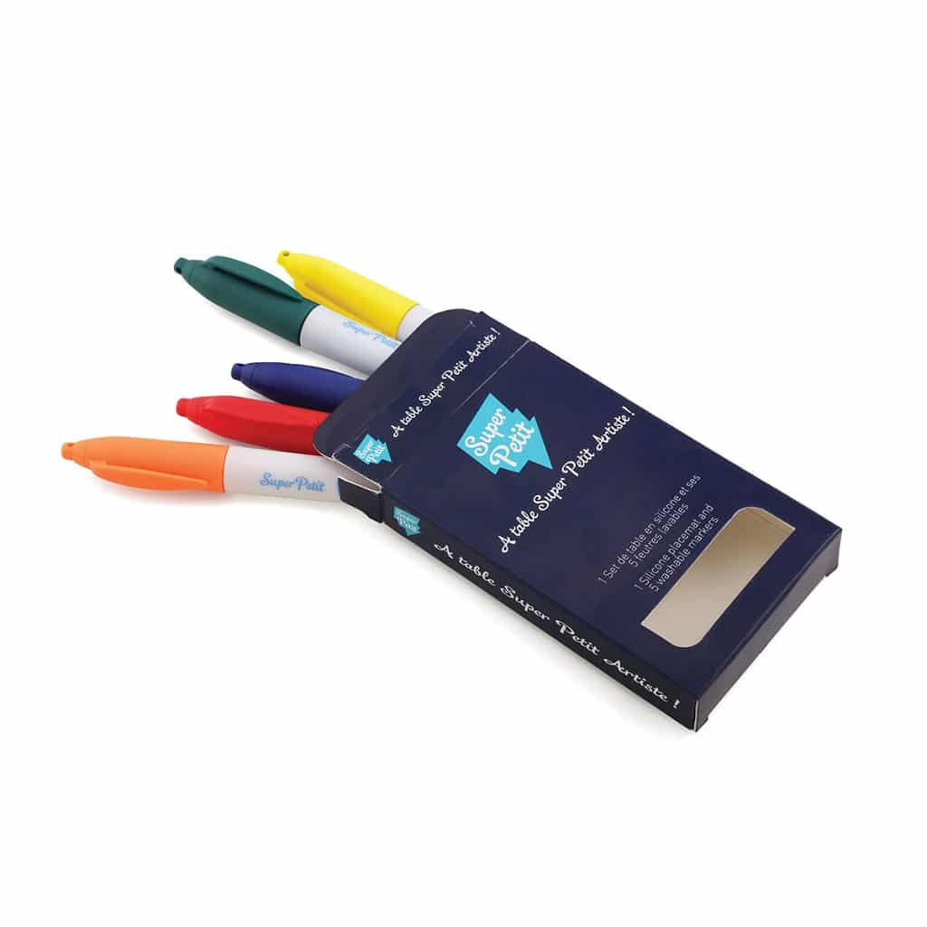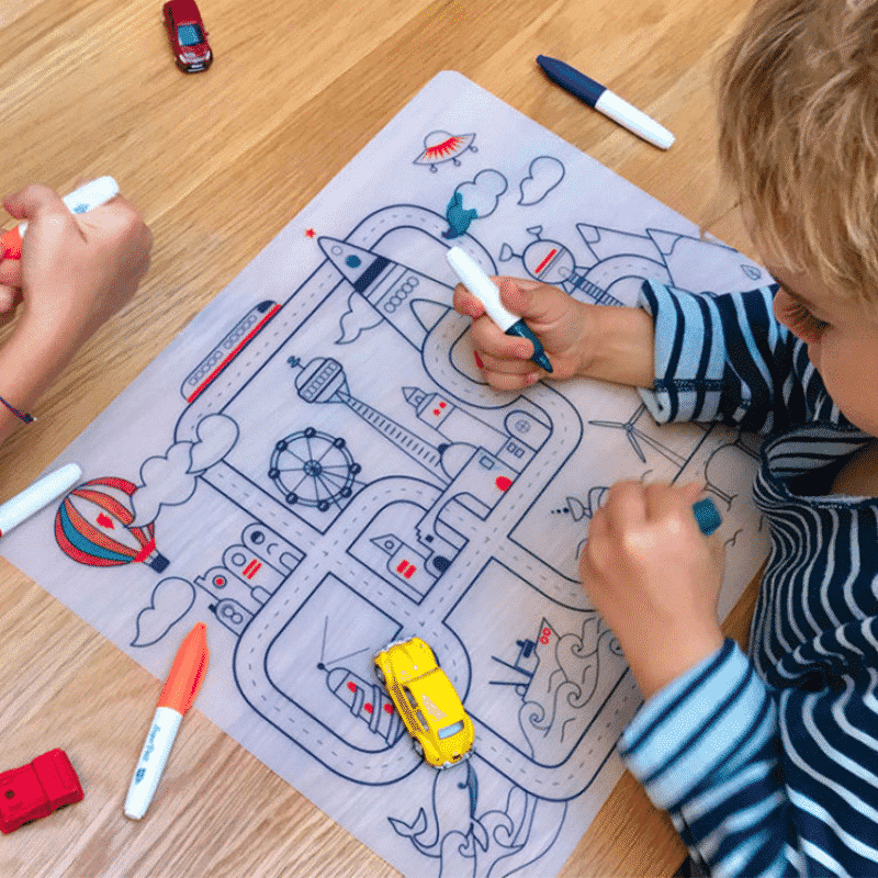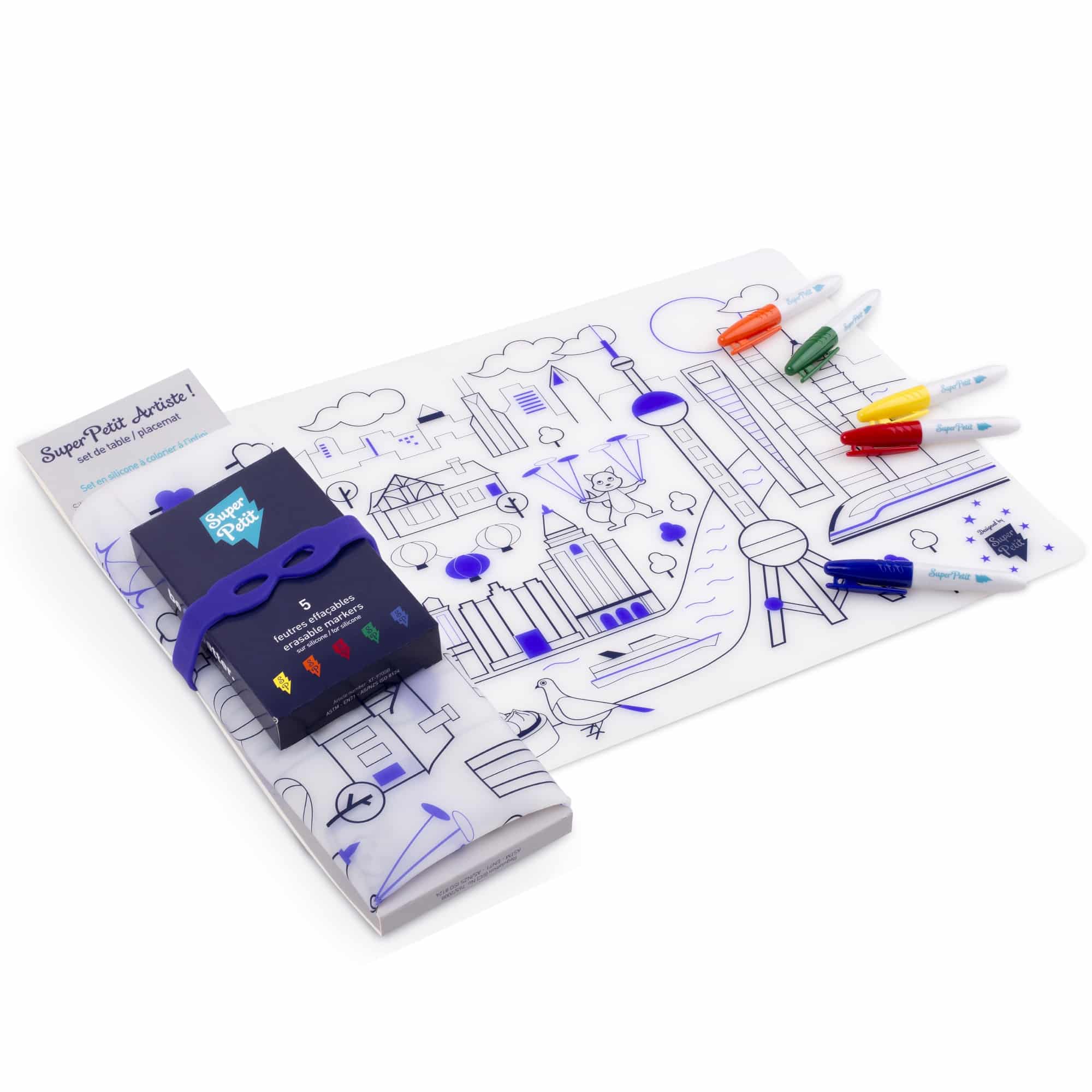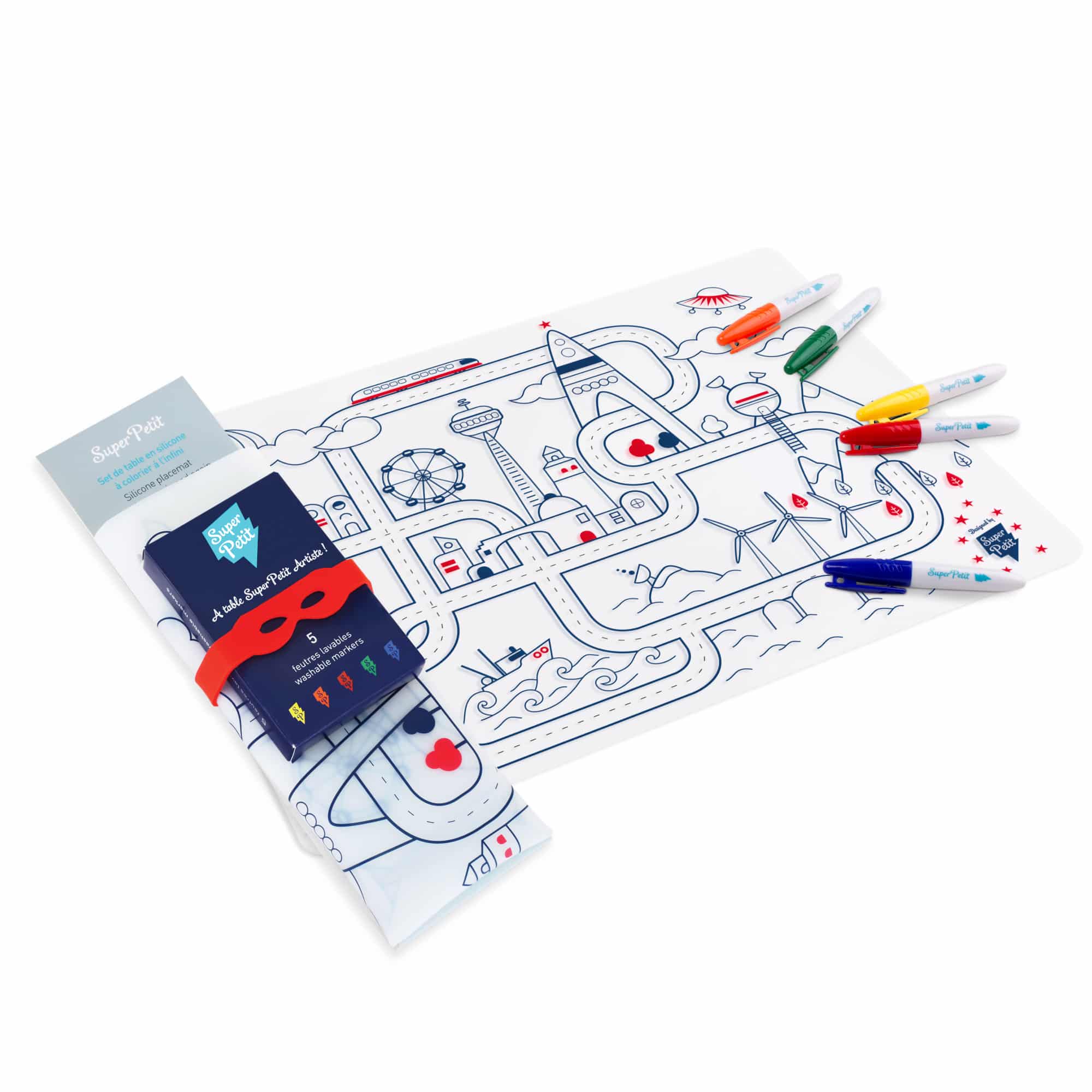 Parce que ce set de table à colorier réutilisable avec feutres ne prend pas de place dans la voiture, dans un sac… Parce qu’il permet à l’enfant de s’occuper sur des temps d’attente Parce qu’il permet à l’enfant de s’exprimer librement autour d’un coloriage, de laisser trace… Parce qu’il est réutilisable Parce qu’il est fourni avec 5 feutres + 1 bracelet Parce qu’il existe plusieurs modèles avec des thématiques différentes