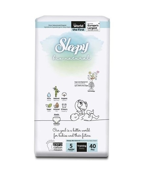 Les couches Sleepy BIO Natural sont de taille 5 et conviennent aux bébés (couches de taille 5) pesant entre 11 et 18 kg. Un paquet contient 40 couches.