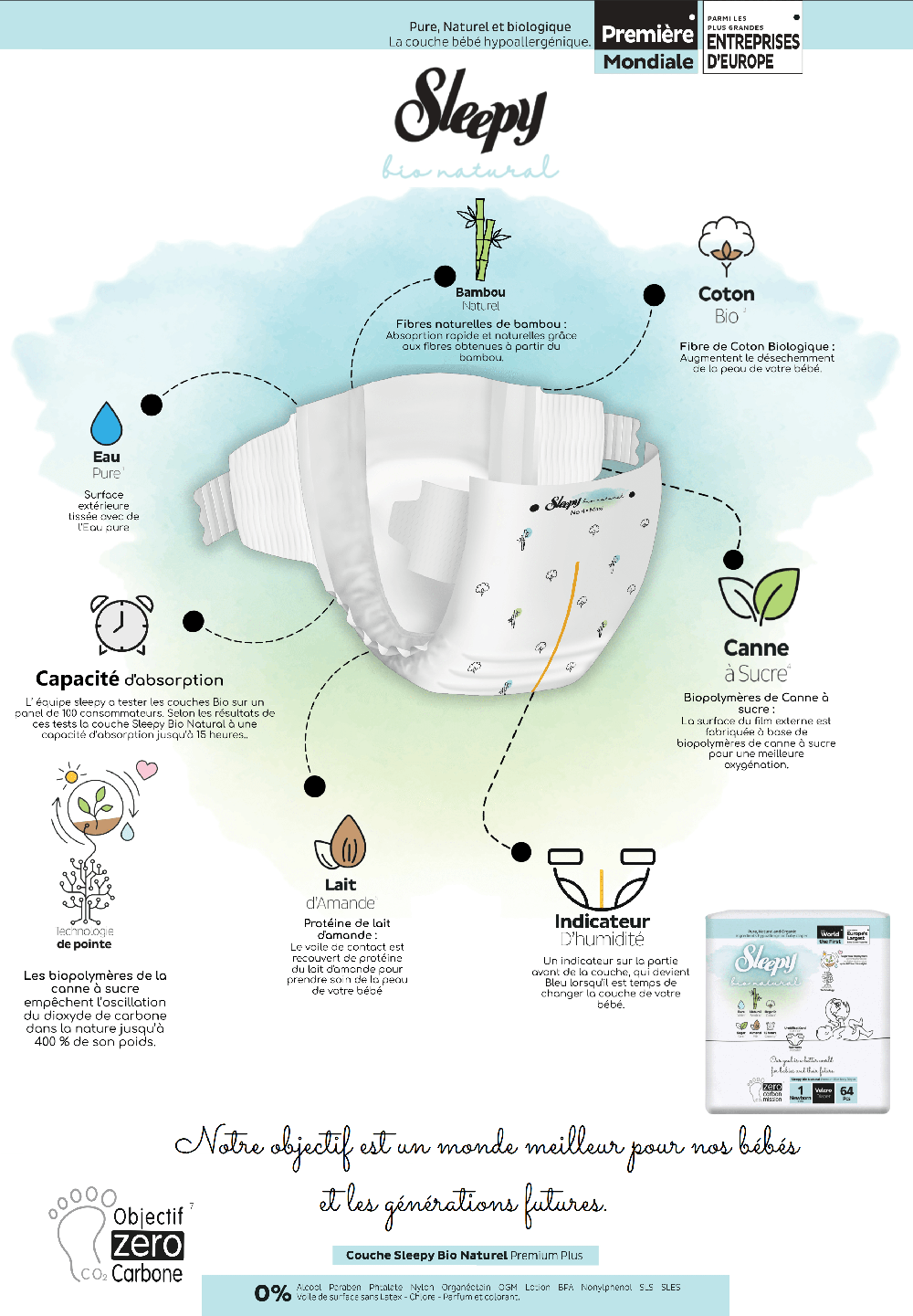 BIOPOLYMÉRE DE LA CANNE À SUCRE – Voile de surface Fabriqué avec du Bioplastique (Polyéthylène végétal), d’origine biosourcé. – La couche contient des biopolymères obtenues à partir de la canne à sucre qui absorbe le taux de dioxyde de carbone jusqu’à 400 fois son poids, et protège ainsi la peau de votre bébé contre l’irritation.