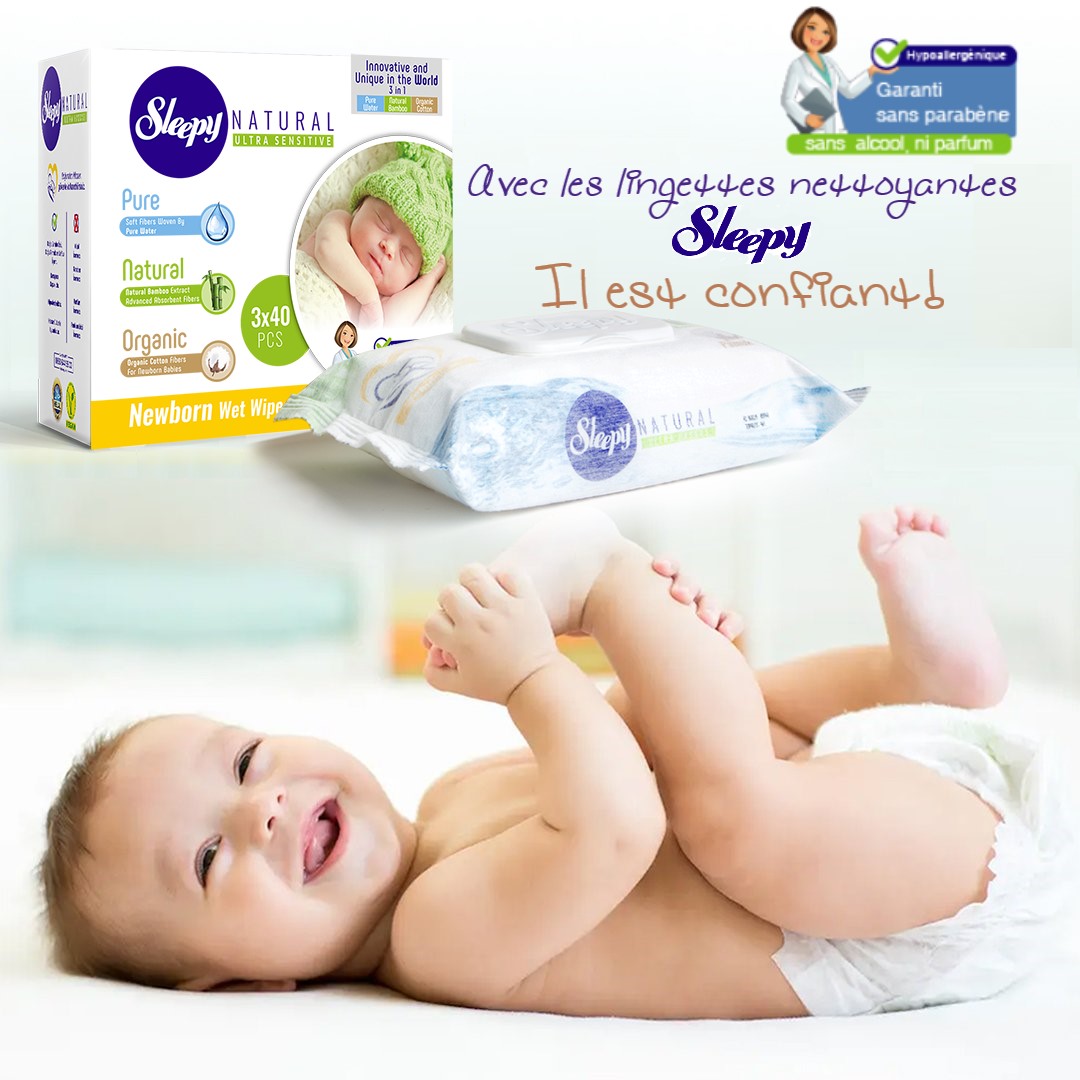 La serviette en coton humide Sleepy Newborn, que vous pouvez utiliser en toute sécurité, ne contient ni alcool, ni paraben, ni parfum.