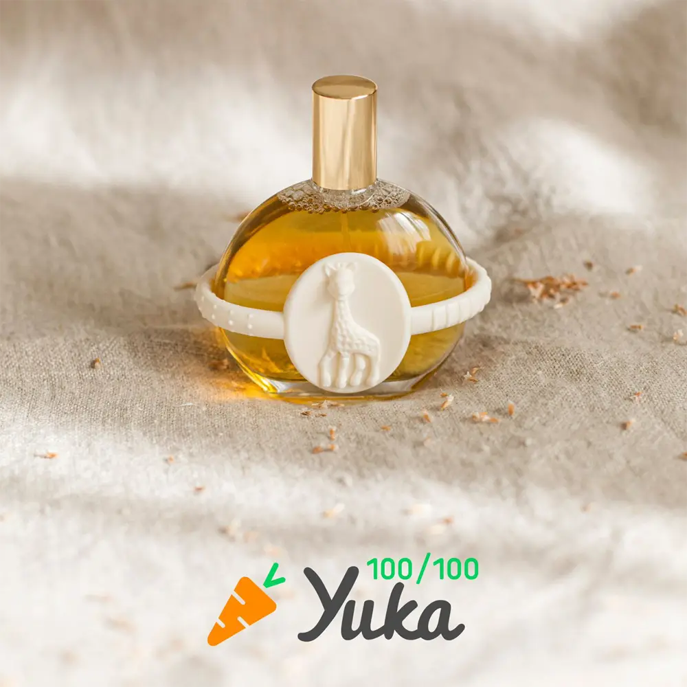 Composée à 97% d’origine naturelle, l’eau de soin parfumée Sophie la girafe® contient des extraits de cerises et sarriette bio, connus pour leurs vertus hydratantes.