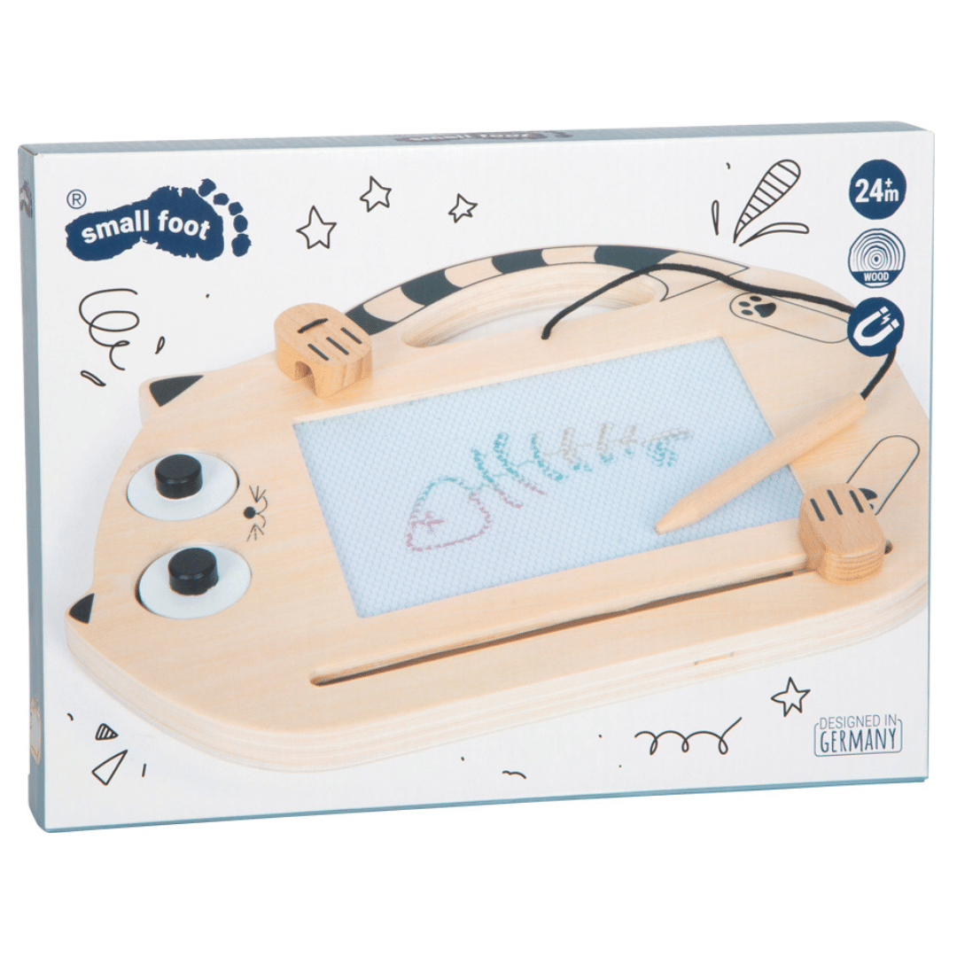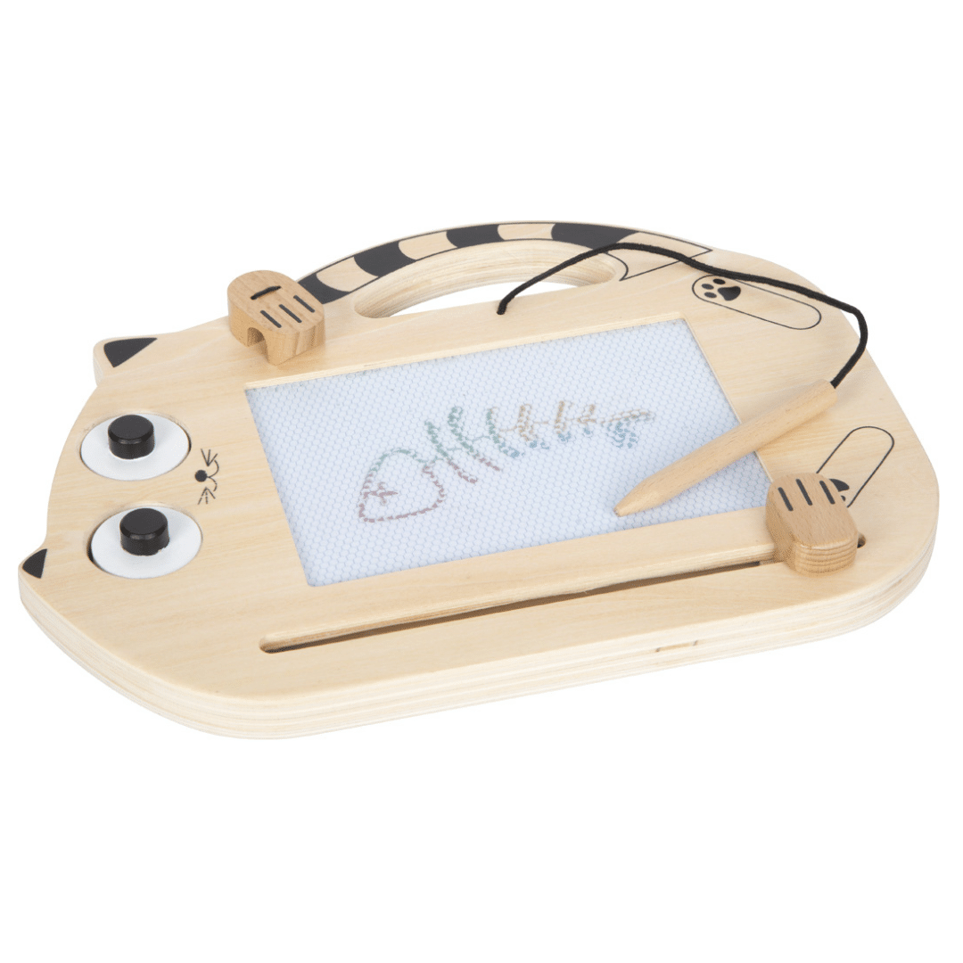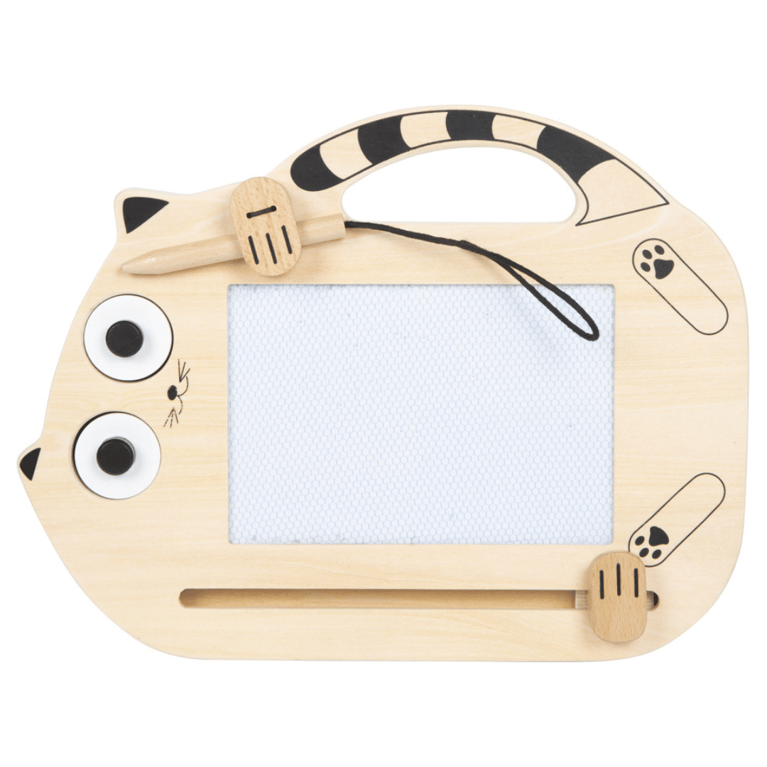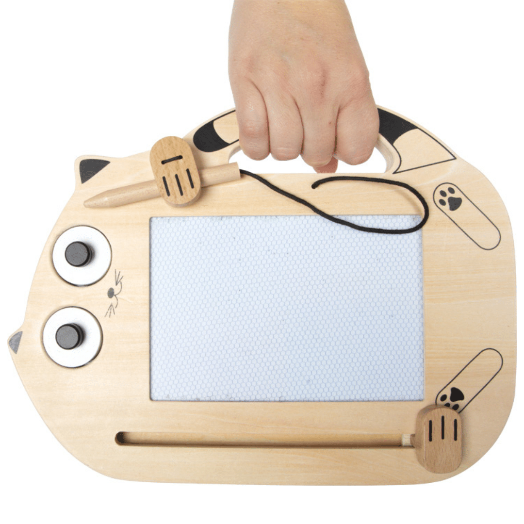 Idéal pour les petits artistes dès 2 ans, ce tableau magnétique permet de dessiner, écrire et effacer à l’infini grâce à son crayon en bois et ses deux tampons aimantés en forme de tête de chat et d’œil de chat.