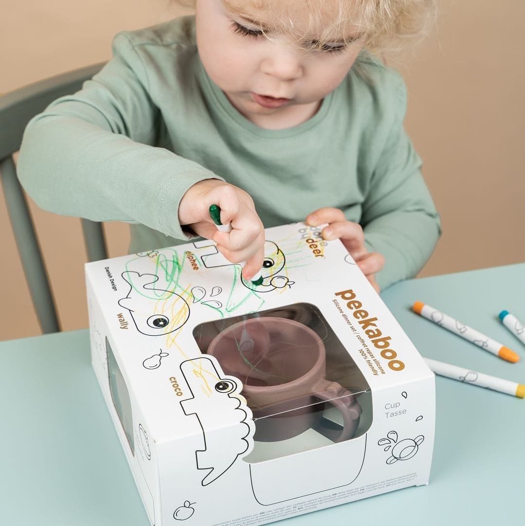 La tasse Croco est issue de la collection Peekaboo de Done by Deer. Croco est couché au fond de cette tasse en silicone, prêt à aider les tout-petits à boire leurs premières gorgées. Cette tasse antidérapante est dotée de deux anses. Son poids et sa taille sont adaptés aux petites mains.